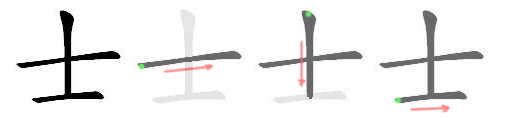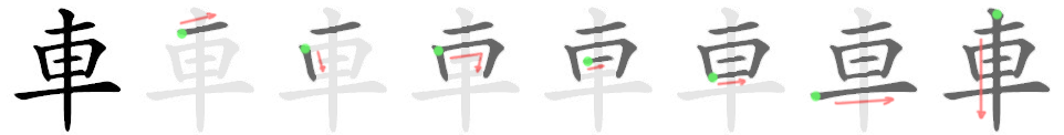 가로 획과 세로 획이 교차할 때, 가로 획이 일반적으로 세로 획보다 먼저 쓰여진다: "열"을 의미하는 글자, 十|십중국어,는 두 획을 가지고 있다. 가로 획, 一|일중국어,이 먼저 쓰여지고, 그 다음 세로 획이 쓰여져 十|십중국어을 만든다.