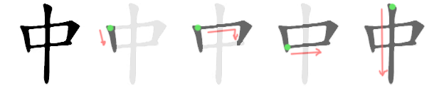 수직 대칭 글자에서는 중앙 구성 요소가 왼쪽 또는 오른쪽의 구성 요소보다 먼저 쓰여진다. 왼쪽의 구성 요소는 오른쪽의 구성 요소보다 먼저 쓰여진다(예: 兜|두중국어 및 承|승중국어).