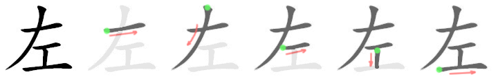이 규칙은 구성 요소의 순서에도 적용된다. 예를 들어, 校|교중국어는 두 부분으로 나눌 수 있다. 전체 왼쪽 부분(木|목중국어)은 오른쪽 부분(交|교중국어)보다 먼저 쓰여진다. 이 규칙에는 몇 가지 예외가 있는데, 주로 글자의 오른쪽 부분에 아래쪽 덮개가 있는 경우에 발생한다(아래 참조).
