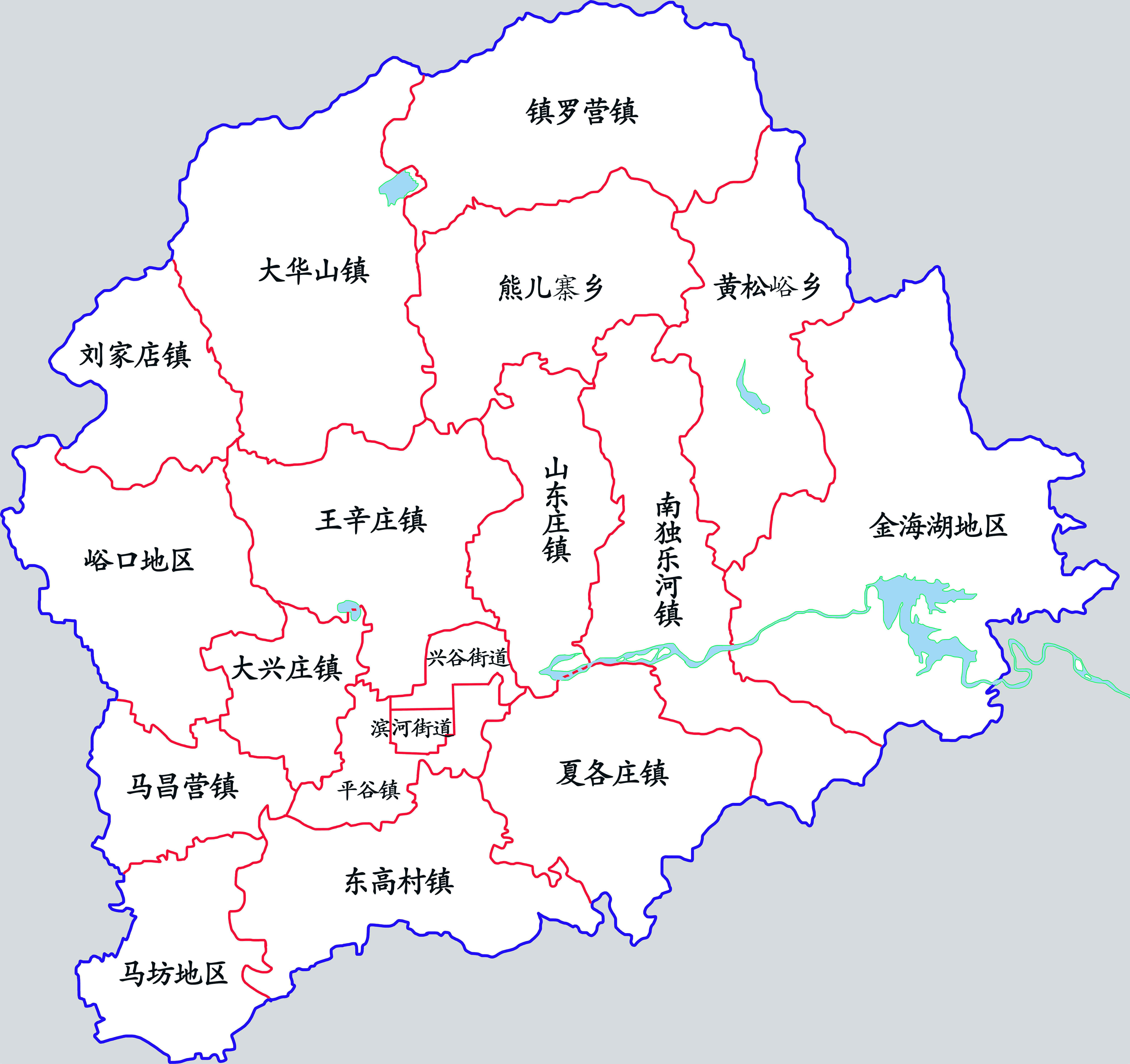 - 진: 둥가오춘 진, 산둥좡 진, 난두러허 진, 다화산 진, 시아거좡 진, 마창잉 진, 왕신좡 진, 다싱좡 진, 류가뎬 진, 전뤄잉 진