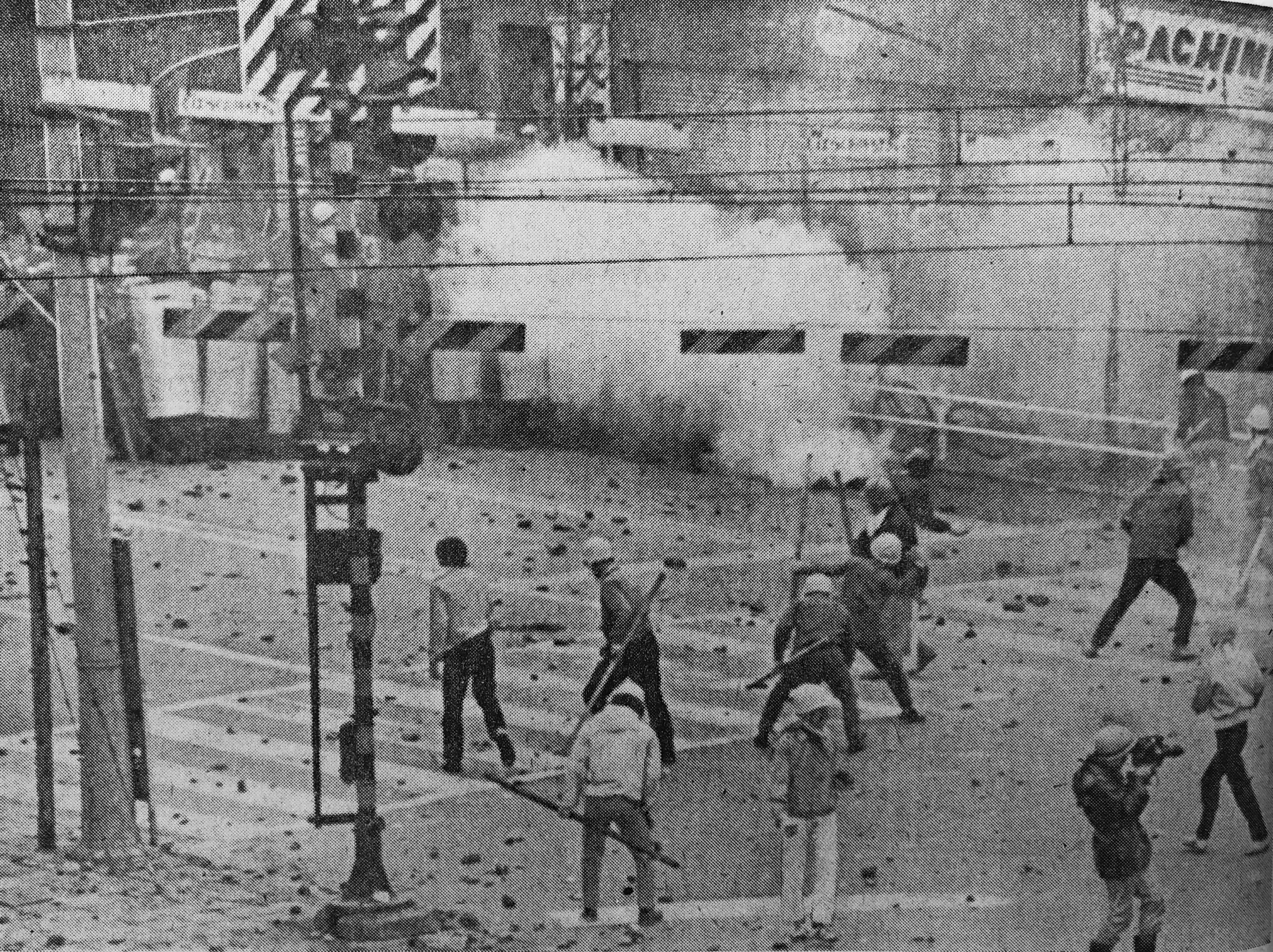 사망자 발생 후, 일시 휴전 상태에서 대치가 이어졌으나, 오후 1시 20분, 기동대가 최루 가스 사용을 경고하고 최루탄을 투척했다.[3][4] 이는 피의 메이데이 사건, 60년 안보 투쟁에 이어 일본 경찰의 세 번째 최루 가스 사용이었다.[3][4][5][6]