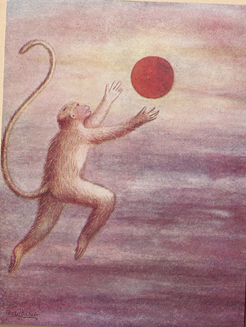 《발미키 라마야나》에 따르면, 하누만은 어린 시절 어느 날 아침 배가 고파 태양을 보았다. 그는 태양을 잘 익은 과일로 착각하고 그것을 먹기 위해 뛰어올랐다. 힌두교 전승의 한 버전에서는 신들의 왕인 인드라가 개입하여 하누만에게 번개를 던졌다. 번개는 하누만의 턱에 명중했고, 하누만은 턱이 부러진 채 죽어 땅에 떨어졌다.[37] 하누만의 아버지 바유는 화가 나 지구에서 모든 공기를 거두어갔다. 공기 부족은 모든 생물에게 엄청난 고통을 초래했다. 이로 인해 시바가 개입하여 하누만을 소생시켰고, 이로 인해 바유는 생물에게 공기를 돌려주었다. 인드라가 실수로 벌인 일이었기 때문에 그는 하누만에게 그의 몸이 인드라의 바즈라만큼 강해질 것이며, 그의 바즈라도 그를 해칠 수 없다는 소원을 허락했다.[37]