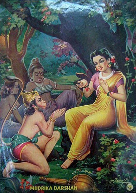 저주가 풀린 하누만은 자신의 모든 신성한 힘을 기억해내고, 산만 한 크기로 변신하여 란카로 가는 좁은 해협을 건너 날아갔다고 한다. 도착하자 그는 란카 왕 라바나와 그의 악마 추종자들로 가득 찬 도시를 발견하고, 개미 크기로 줄어들어 도시로 잠입한다. 도시를 수색한 후 그는 악마 전사들이 지키고 있는 숲에서 시타를 발견한다. 시타는 라바나가 그녀를 납치했고 곧 그녀와 결혼하라고 강요하고 있다고 밝힌다. 하누만은 그녀를 구출하겠다고 제안하지만 시타는 남편이 그렇게 해야 한다고 말하며 거절한다.[38][39]