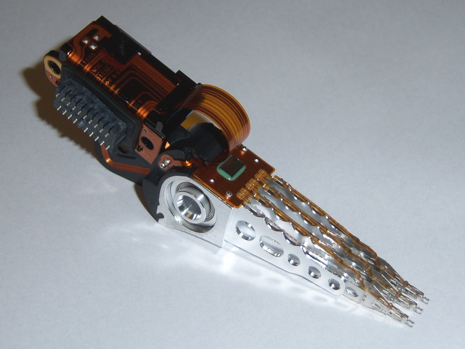 : 데이터를 읽고 쓰는 헤드로, 스핀들 모터가 작동할 때 헤드는 제어 회로를 통해 나노미터 단위로 부상하여 기록한다. 헤드가 부상되지 않은 상태에서 스핀들 모터가 작동될 경우에는 플래터에 손상을 주어 베드 섹터 등의 복구가 불가능한 문제로 번질 수 있다. 헤드의 기록 방식에는 수직 기록 방식과 수평 기록 방식이 있다. 수직 기록 방식은 수직으로 데이터를 기록하기 때문에 수평 기록 방식에 비해 플래터당 기록 밀도를 훨씬 높일 수 있으며, 자성의 손실이 거의 없어 데이터의 수명이 더 길다.