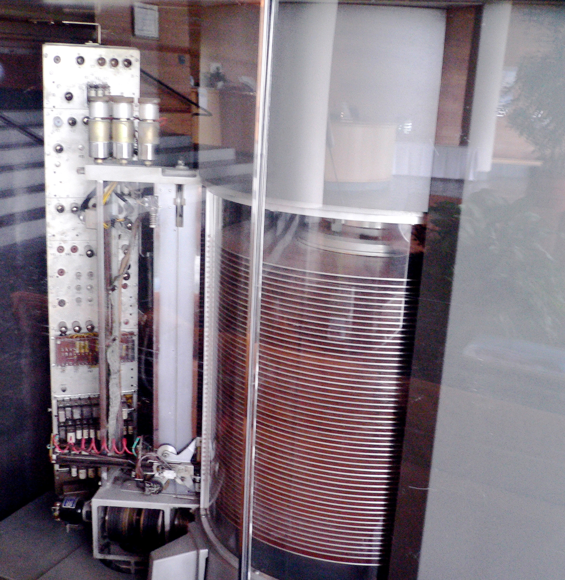 1956년 미국의 IBM은 최초의 상용 하드 디스크 드라이브인 RAMAC을 출시했다.[186] 이 드라이브는 메인프레임과 미니컴퓨터에 탑재하기 위해 만들어졌으며, 지름 24인치의 플래터 50장으로 약 4.8 MiB의 용량을 제공했고, 가격은 약 5만 달러였다.