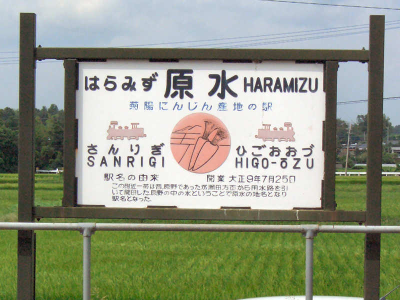 1920년 7월 25일, 철도성이 미야지 경편선의 사토기 - 히고오즈 사이에 하라미즈역을 신설 개업하였다.[8] 이 노선은 구마모토에서 동쪽으로 뻗어 히고오즈역까지 이어졌다.