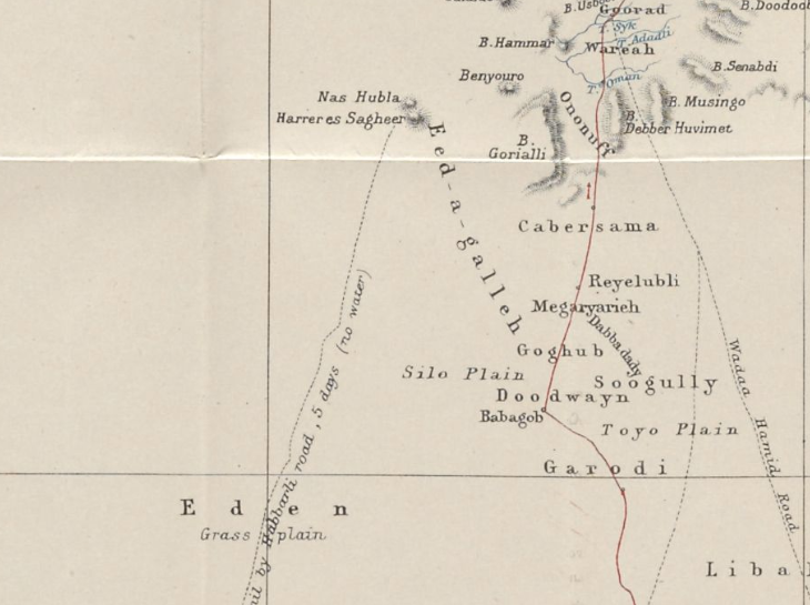 > 이 마을은 알레야데라 날라(강 이름)의 오른쪽 강둑에서 약 약 457.20m 떨어진 곳에 있으며, 강바닥보다 약 9.14m에서 약 12.19m 높은 곳에 자리 잡고 있다. 마을 주변에는 길이 약 4.02km, 너비 약 0.40km에 달하는 조와리(수수) 경작지가 펼쳐져 있다. 온갖 종류의 가축들이 알레야데라 날라에서 약 0.80km 떨어진 낮고 완만한 언덕에서 풀을 뜯는다. 하르게이사는 오가덴과 하라르에서 오는 중요한 대상로 두 개가 만나는 지점에 위치하며, 베르베라와 불하르로 가는 좋은 낙타길도 있다. 무역 시즌에는 쌀, 담배, 대추 등을 이곳에서 구할 수 있다. 약 400명의 사람들이 조와리 밭을 돌보는 데 고용되어 있으며, 높은 단상에 앉아 소리를 지르거나 돌을 던져 작물에서 새를 쫓는 모습을 볼 수 있다. 강바닥에는 양질의 물이 풍부하며, 아덴 출신 아랍인이 관리하는 석조 우물이 있다. 마을에는 셰이크 마다르와 그의 물라들의 보살핌을 받는 많은 시각 장애인과 지체 장애인들이 있다.[26]