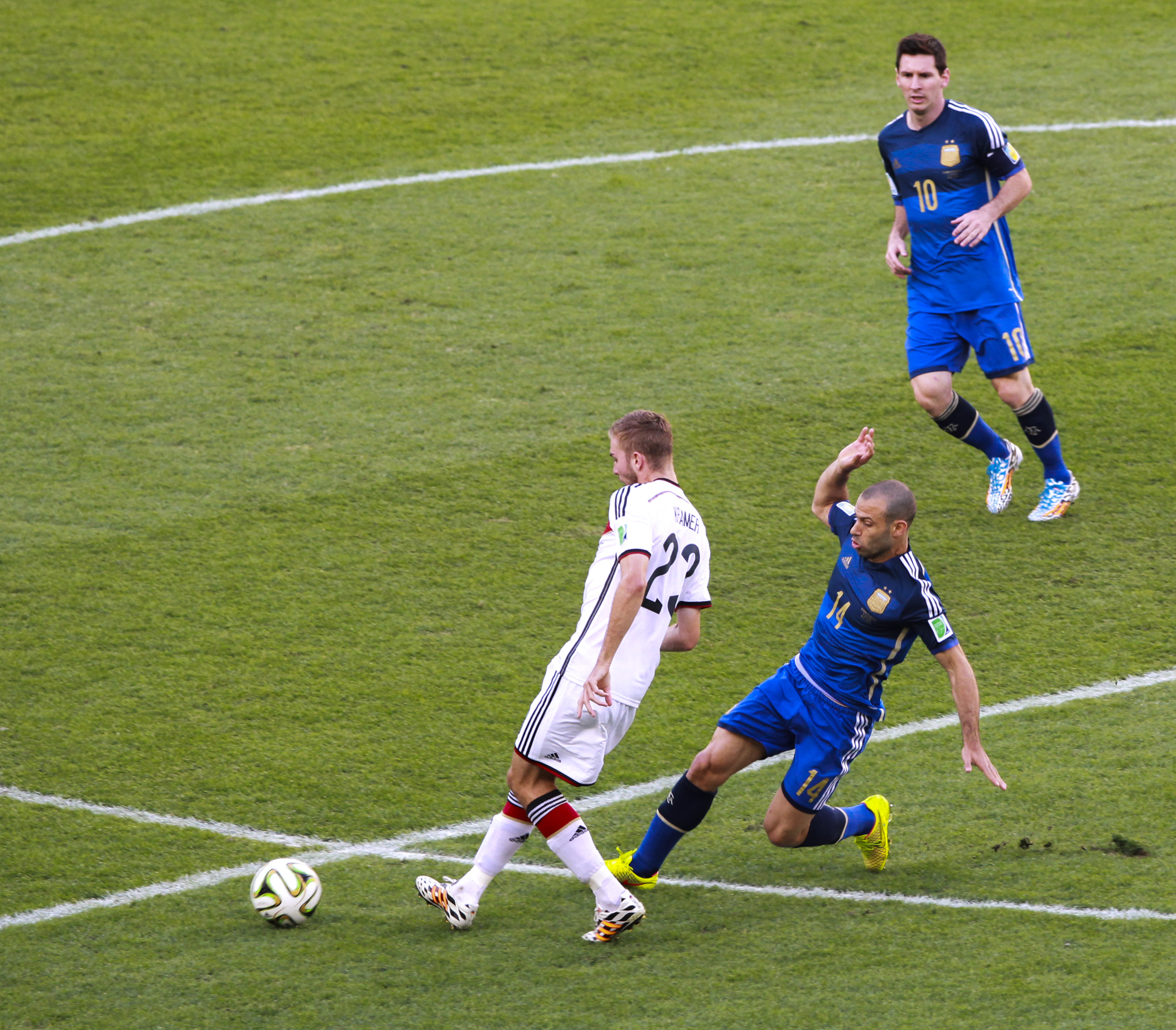 2014년 FIFA 월드컵에서는 이란 축구 국가대표팀과의 경기에서 A매치 100경기 출전을 달성했다.[82] 마스체라노는 뛰어난 수비력과 리더십으로 팀을 이끌며 준우승에 크게 기여했고, FIFA 골든볼 후보 10인에 선정되었다.[88] 특히, 네덜란드와의 준결승전에서는 아르연 로번의 결정적인 슈팅을 막아내는 등 인상적인 활약을 펼쳤다.[81][86]