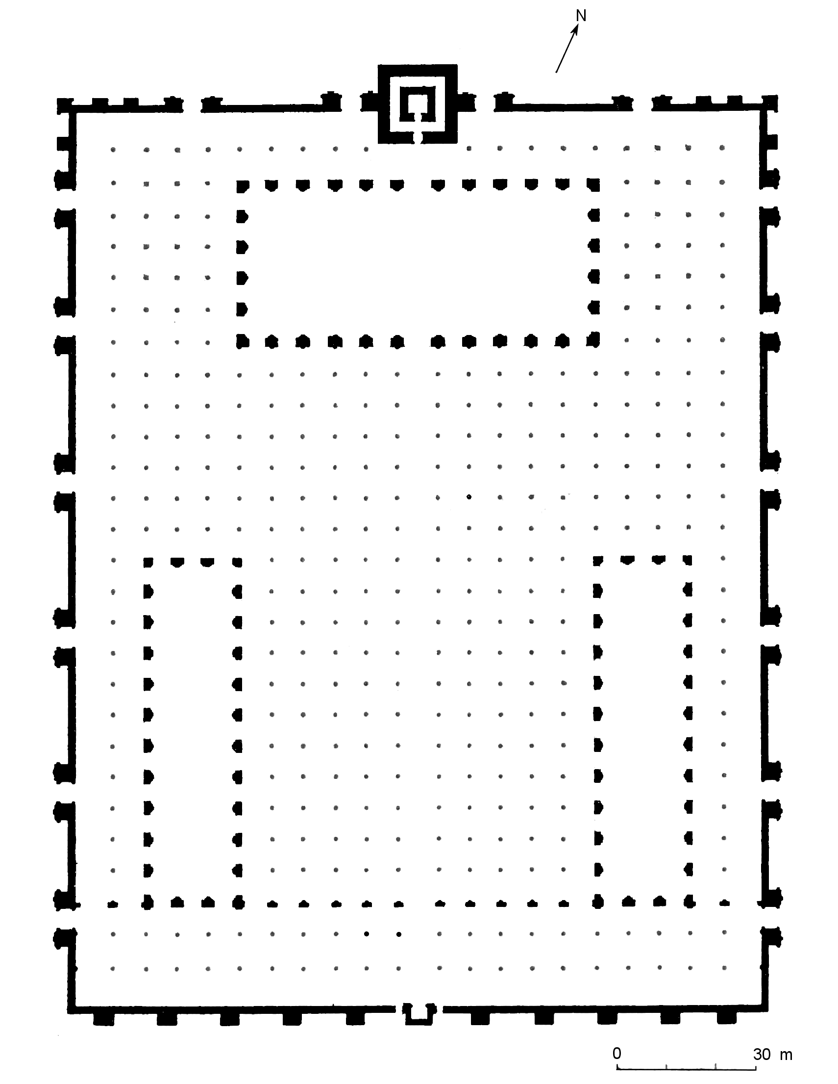 원래 계획에는 세 개의 작은 안뜰이 포함되어 있었는데, 하나는 뒤쪽에 있고 ''키블라'' 벽과 평행하며, 다른 두 개는 예배당 양쪽에 있어 아케이드를 통해 햇빛과 신선한 공기가 들어올 수 있게 했다.[10][2] 이것은 대부분의 사원이 주 안뜰을 하나만 가지고 있다는 점에서 또 다른 특이한 특징이었지만, 이 디자인의 동기는 사원의 크기와 전례 없이 넓은 내부로 더 많은 빛을 가져와야 할 필요성 때문이었을 것이다.[11] 모스크는 12개의 입구로 이루어진 183mx139m 크기로, 그 내부에는 21개의 방이 만들어질 예정이었다.[16] 또한, 부지 내에는 공사 중단된 벽과 300개[16]의 기둥 등이 그대로 남아 있다.