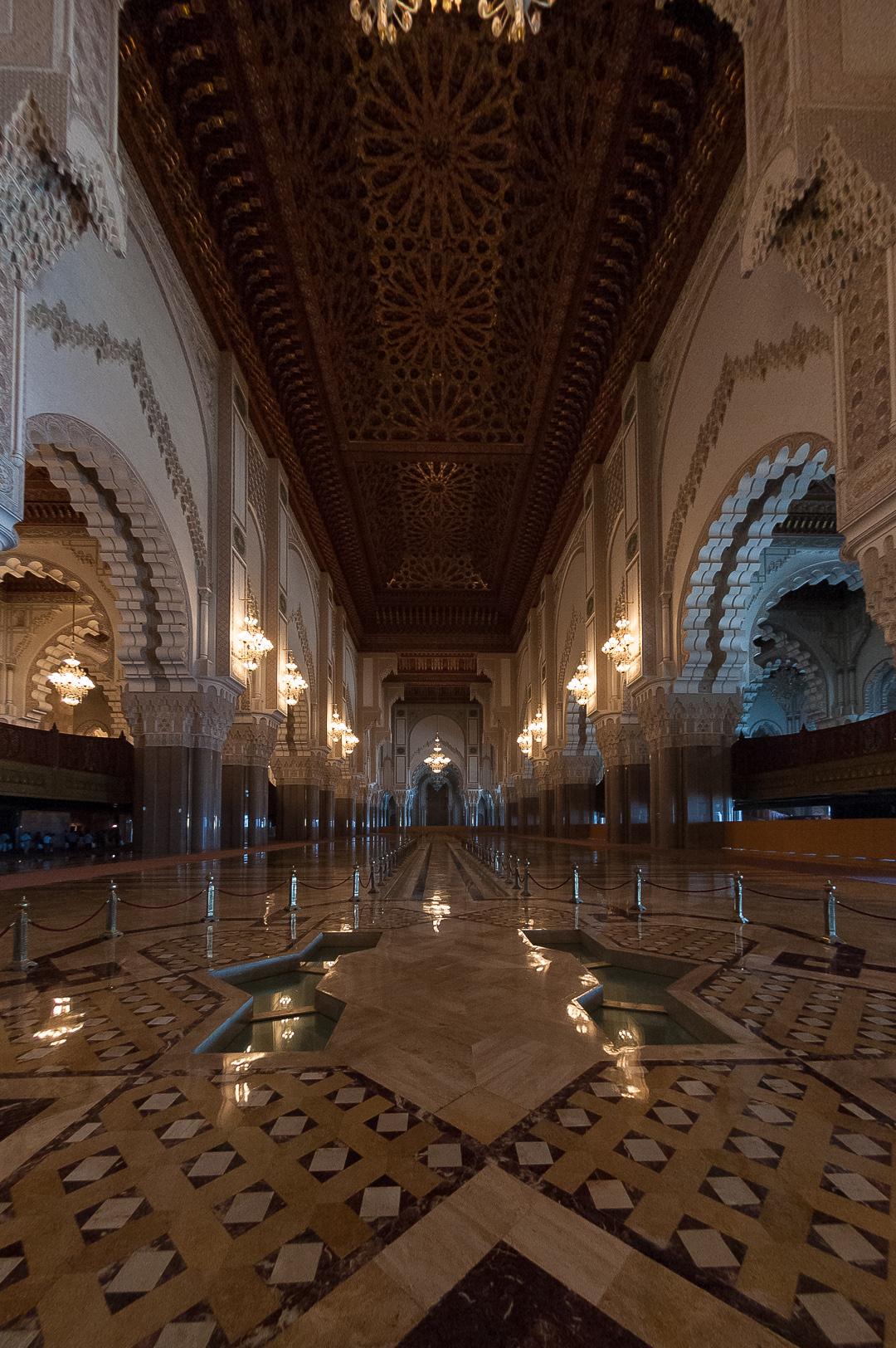 기도실은 모스크 상단에 위치하며 창문으로 덮여 있다. 중앙 홀은 중앙 난방 시설을 갖추고 있으며, 대서양의 탁 트인 수중 전망을 제공한다. 홀의 장식은 정교하고 훌륭하며, 모로코의 숙련된 장인 6,000명이 참여하여 만들어졌다. 그 규모가 매우 커서 파리의 노트르담이나 로마의 성 베드로 대성당을 쉽게 수용할 수 있다. 목각, 젤리지 작업, 회반죽 몰딩은 정교하고 인상적인 디자인으로 이루어져 있으며, 조각에 사용된 나무는 중앙 아틀라스 산맥에서 가져온 삼나무이고, 대리석은 아가디르에서, 화강암은 타프라우트에서 가져왔다.[13]