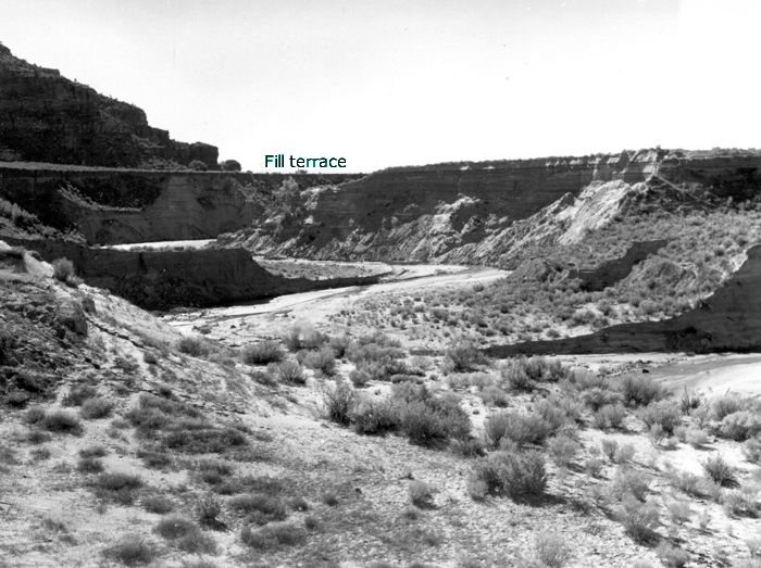 '''충적단구(Fill terraces):''' 충적단구는 기존 계곡이 충적층(alluvium)으로 채워짐으로써 형성된다. 계곡이 충적층으로 채워지는 이유는 빙하 작용(glaciation)으로 인한 하상 하중(bed load)의 증가 또는 하천의 유량 변화(stream power) 등 여러 가지가 있다. 하천이나 강은 평형 상태에 도달하여 물질을 운반하기보다는 퇴적할 때까지 물질을 계속 퇴적한다. 조건이 다시 변하고 하천이나 강이 계곡에 퇴적된 물질을 침식하기 시작하면 충적단구가 생성된다.[5] 이렇게 되면 계곡 측면에 충적층으로만 구성된 단구가 형성된다. 가장 높은 단구가 충적단구이다. 하천이나 강이 충적층을 계속 침식하면 충적단구는 하천 또는 강의 수로 위에 남게 된다(때로는 100m 이상). 충적단구는 퇴적 과정에서 가장 높은 단구일 뿐이며, 충적단구 아래에 여러 개의 단구가 있다면 이를 "절단단구"라고 한다.[5]