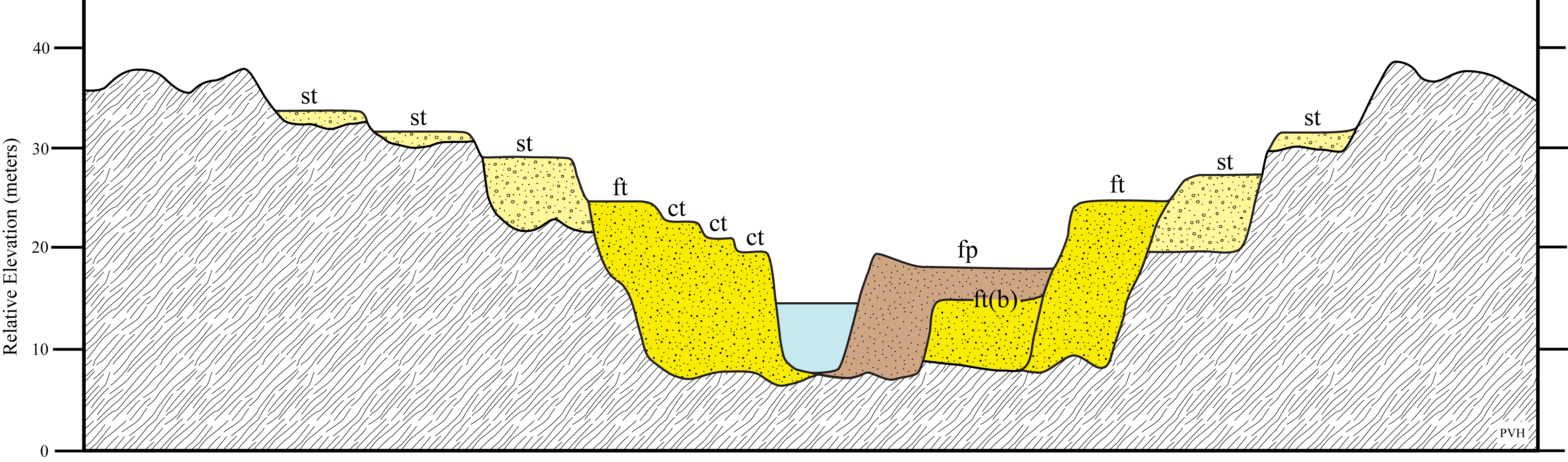 기반암단구는 하천이나 강이 기반암을 하방침식(downcutting)하면서 형성된다.[6] 하천이나 강이 계속해서 하방 침식하는 과정에서 융기 속도의 감소 또는 일시 중지, 기후 변화, 기반암 유형 변화 등의 이유로 하천계가 평형 상태에 도달하면 계곡의 폭이 넓어지는 시기가 올 수 있다.[6] 하방 침식이 다시 진행되면, 얇은 충적층으로 덮여 있을 수 있는 기반암으로 구성된 평평한 계곡 바닥이 하천이나 강 수로 위에 남게 된다.[6] 이러한 기반암 단구는 침식 작용에 의해 형성된다.[6]3. 3. 쌍을 이루는 단구와 쌍을 이루지 않는 단구