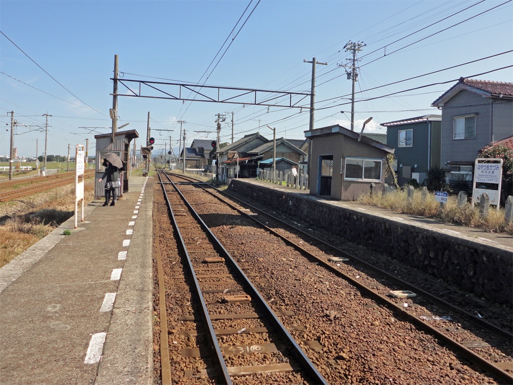 상대식 승강장 2면 2선을 갖춘 지상역이다. 개업 당시의 목조 역사를 가진 무인역이다. 과거 평일 단 한 편, 당역 시발 상행 열차가 존재했지만, 이는 나메리카와역 종착 하행 열차가 당역까지 회송된 것이었다. 최근, 사라져가던 역사 입구 위에 있는 역명 표기가 구자체의 "驛" 그대로 다시 쓰여졌다.