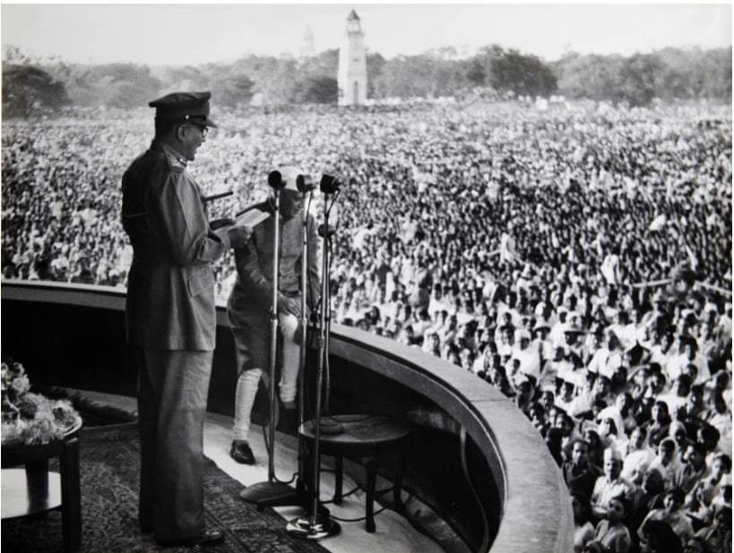 네루가 지켜보는 가운데 파테 마이단에서 군중들에게 연설하는 초우드리 소장