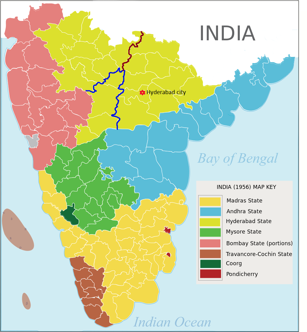 1956년, 언어적 경계에 따라 인도 주 재편성이 진행되는 동안, 하이데라바드주의 텔루구어 사용 지역은 안드라 주와 병합되었다. 마라티어 사용 지역은 봄베이 주에, 칸나다어 사용 지역은 마이소르 주에 병합되었다.