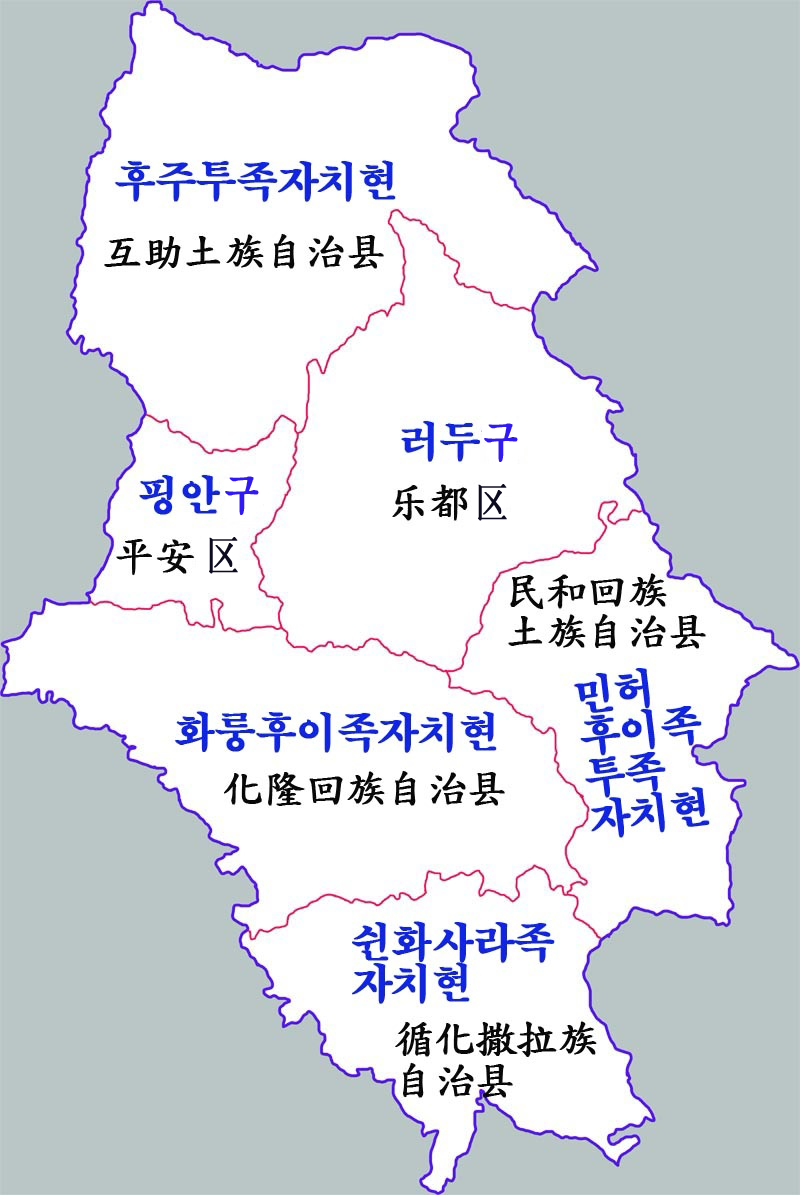 종류 | 러두 구 러투 현 민허 후이족 투족 자치현 후주 투족 자치현 화룽 후이족 자치현 쉰화 살라족 자치현 |