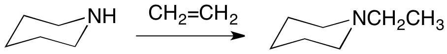 강한 염기는 하이드로아미노화를 촉매하는데, 예를 들어 에틸기를 사용하여 피페리딘을 에텐으로 에틸화하는 반응이 있다.[27]