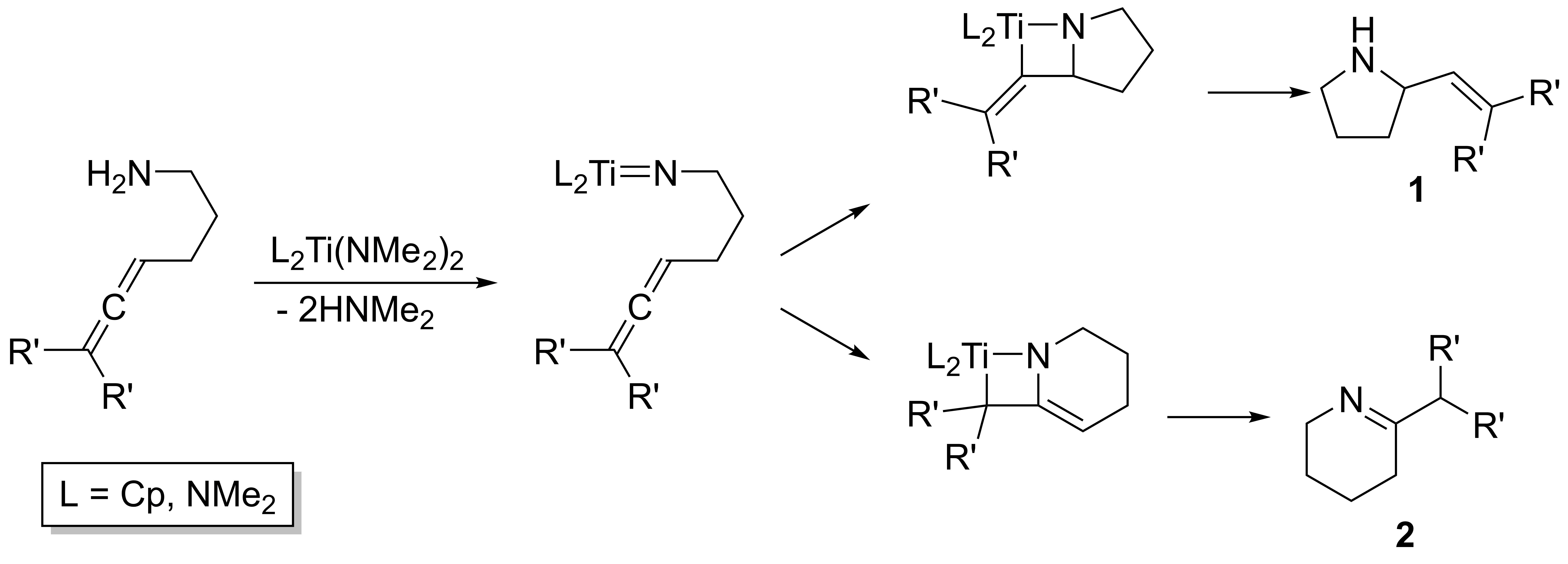 특정 타이타늄 및 지르코늄 배위 착물은 알카인 및 알렌의 분자간 하이드로아미노화를 촉매한다.[3] 티타노센 아미도 및 술폰아미도 착물은 해당 아자메탈라사이클로부탄을 형성하는 [2+2] 고리 부가 반응을 통해 아미노알켄의 분자내 하이드로아미노화를 촉매한다. 후속적으로 들어오는 기질에 의한 프로톤 분해는 α-비닐-피롤리딘('''1''') 또는 테트라히드로피리딘('''2''') 생성물을 생성한다.