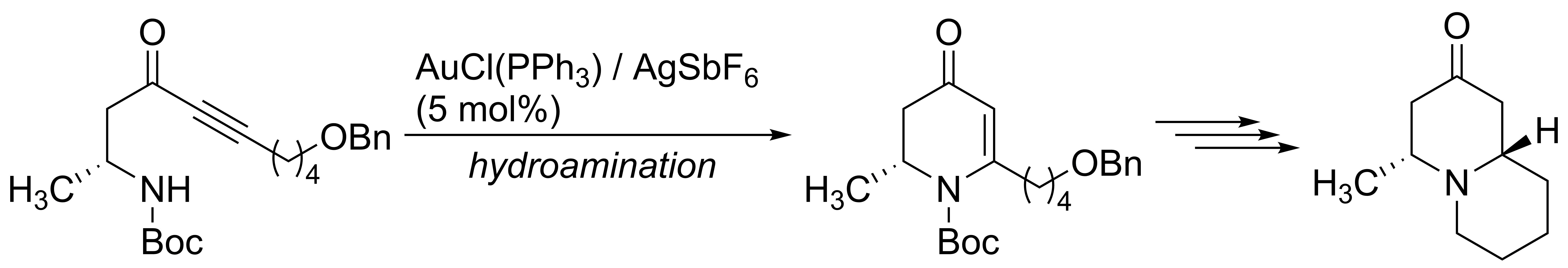 하이드로아미노화는 또한 알칼로이드의 합성에 유망하다. 한 예는 (-)-에피미르틴의 총 합성에 사용된 하이드로아미노화 단계였다.[30]