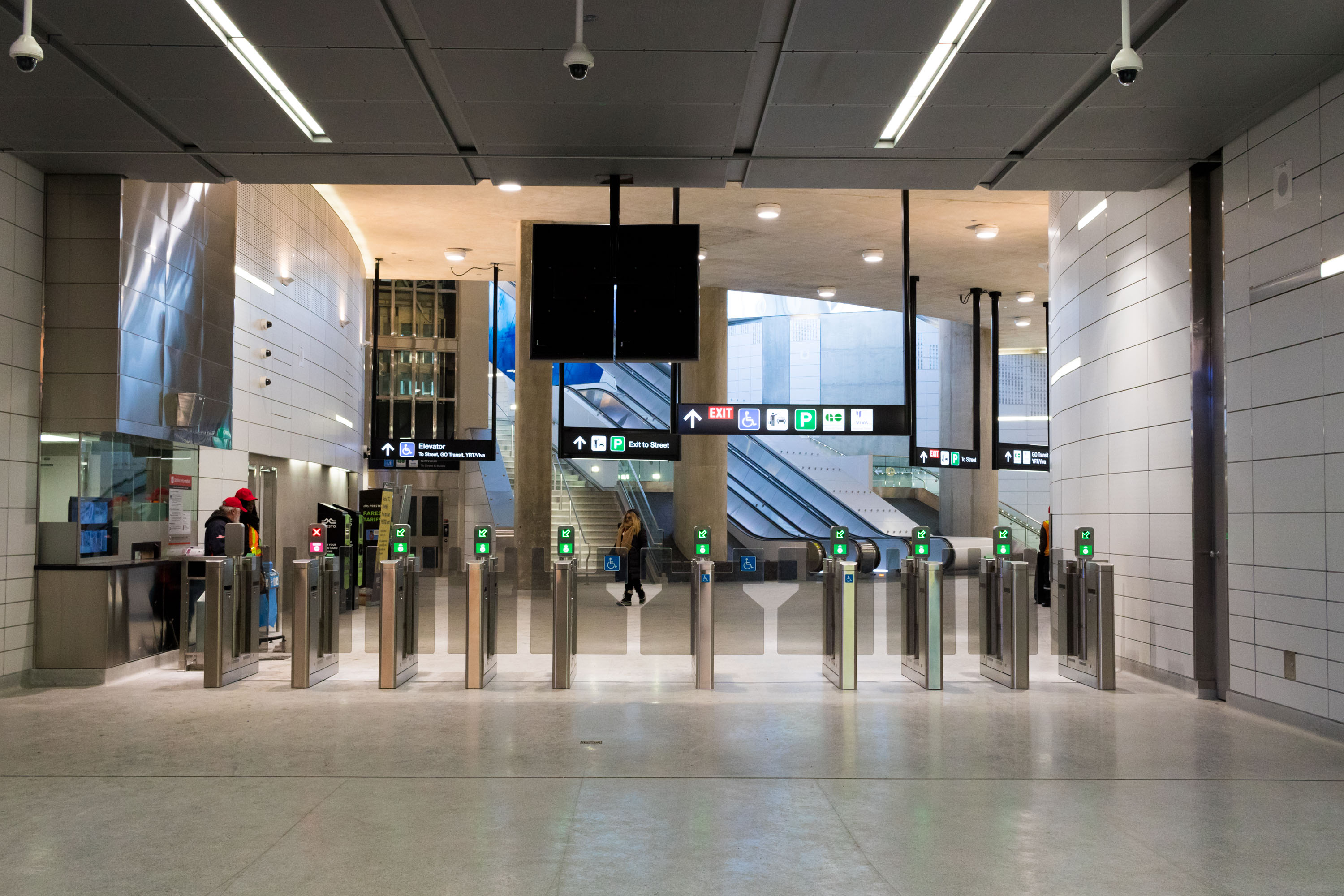 토론토 출신 예술가 데이비드 펄은 지하철 채광창과 서부 버스 터미널 유리 외관을 위해 다채로운 유리 패널로 구성된 ''스카이 엘립스''라는 작품을 디자인했다. 이 패널들은 움직이는 색상 투영을 보여주며, 햇빛은 플랫폼 층까지 내려온다.[5][6][7]