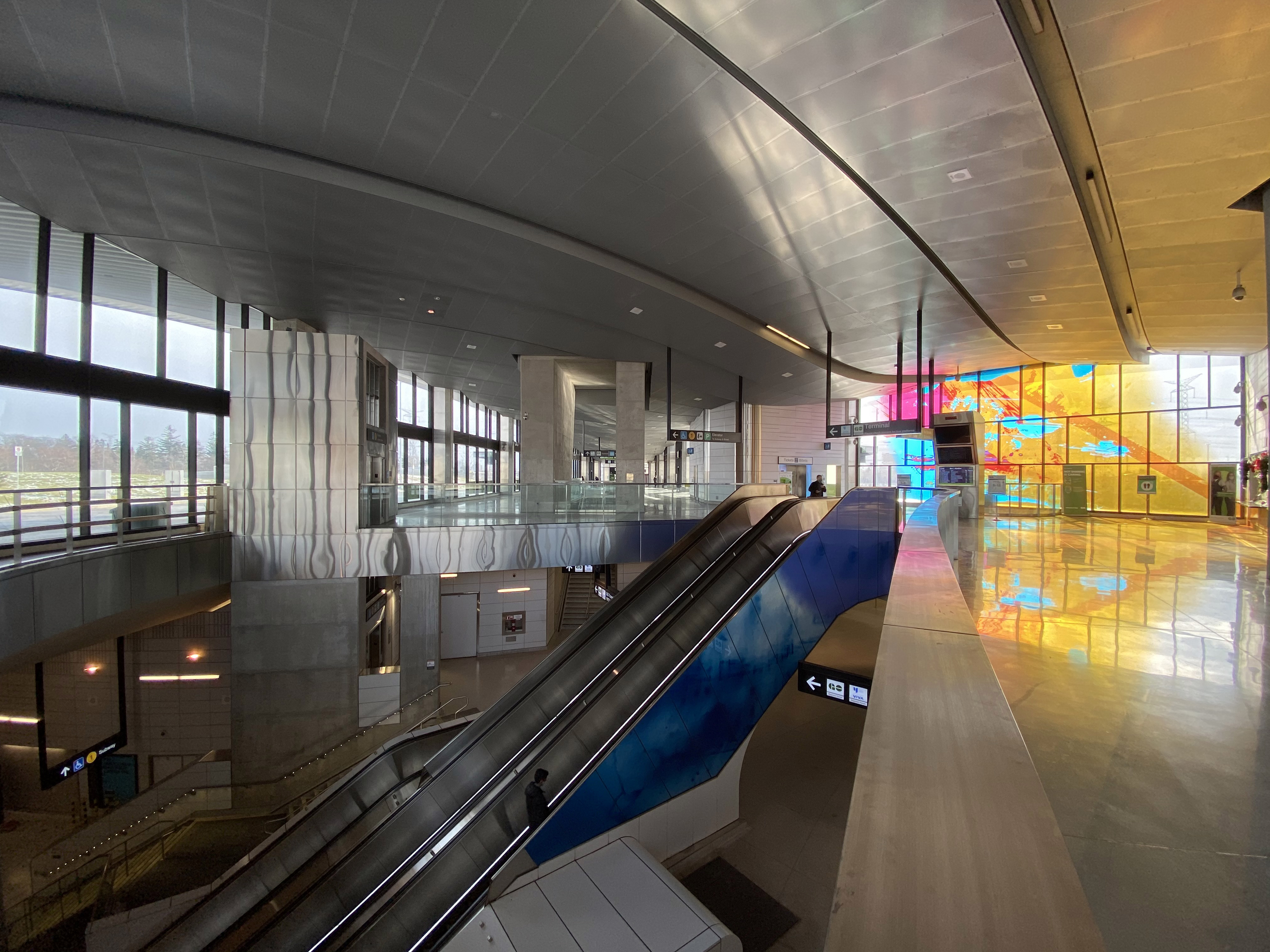 토론토 출신 예술가 데이비드 펄은 지하철 채광창과 서부 버스 터미널 유리 외관을 위해 다채로운 유리 패널로 구성된 '스카이 엘립스'라는 작품을 디자인하였다. 패널은 움직이는 색상 투영을 보여주며, 햇빛은 플랫폼 수준까지 여과되어 내려온다.[5][6][7] 펄에 따르면 표현력 있는 다채로운 유리는 자연광과 역 승객들의 역동성과 조화를 이루어 역 공간과 내부 표면에 활기를 불어넣게 되며, 자연광과 조화되는 색상을 도입하여 태양의 주기와 리듬에 맞추게 되고 그린벨트 주변 환경에 대한 건축물의 조화를 이루고자 하였다고 밝혔다.