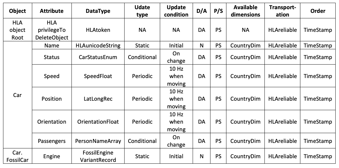 | P/S | 속성을 게시하거나 구독할 수 있는지 여부. SOM에서는 설명된 페더레이트와 관련되며, FOM에서는 전체 연합과 관련됨 (Publish/Subscribe/PublishSubscribe/Neither) |