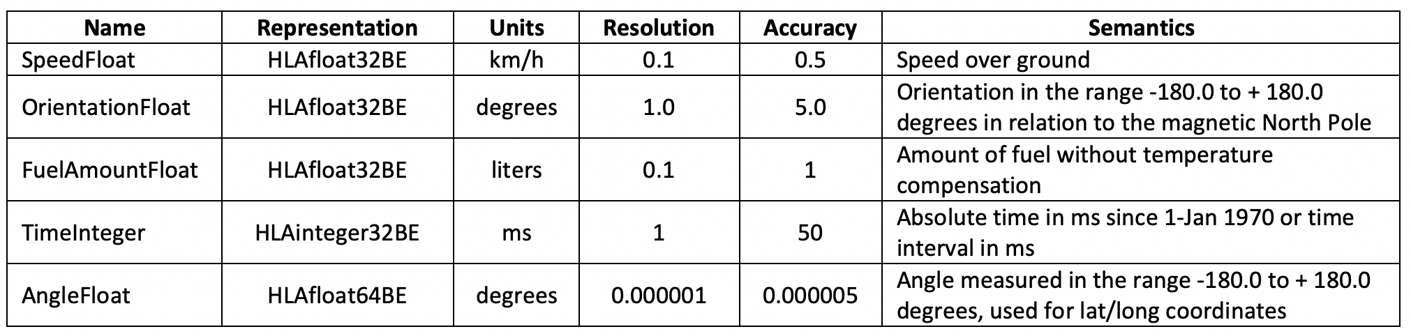 HLA 표준에는 HLAASCIIchar, HLAunicodeChar, HLAbyte, HLAinteger64time 및 HLAfloat64time과 같이 미리 정의된 여러 단순 데이터 유형이 제공된다. 사용자 정의 단순 데이터 유형을 FOM에 포함하는 것이 일반적이다. 단순 데이터 유형 테이블은 단순 스칼라 데이터 항목을 설명하는 데 사용된다.
