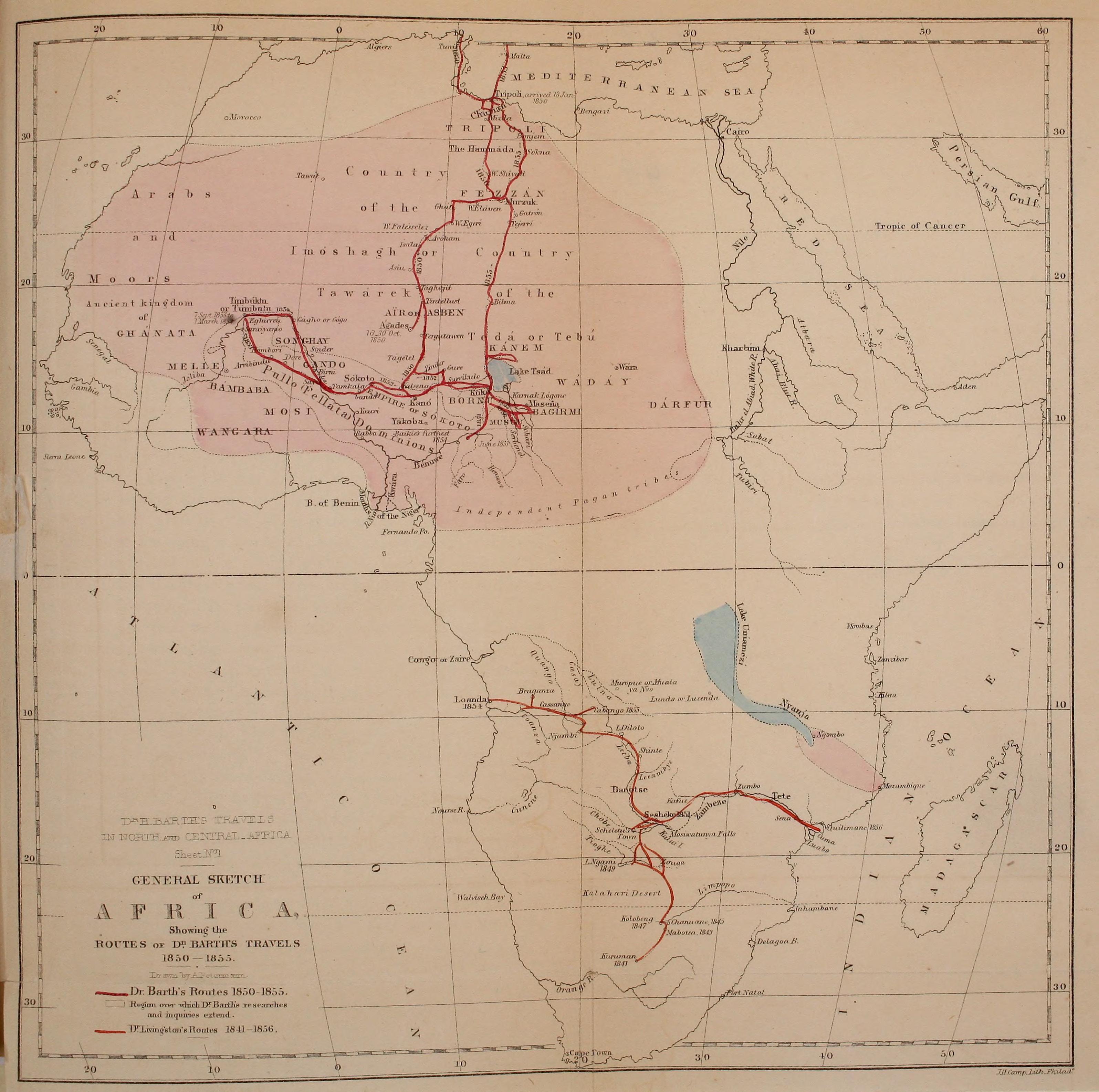 바르트는 1850년 초 트리폴리를 출발하여 사하라 사막을 건넜다. 1850년 10월 아가데즈 시에 도착하여 며칠 동안 머물렀다. 그는 1851년 아다마와를 방문한 최초의 유럽인이었다. 1855년 9월 트리폴리로 돌아올 때까지, 그의 여정은 북쪽 트리폴리에서 남쪽 아다마와와 카메룬까지, 동쪽 차드 호와 바기르미에서 서쪽 팀부크투 (1853년 9월)까지 이어졌다. 그는 방문한 국가의 지형, 역사, 문명, 언어 및 자원을 면밀히 연구했다.[2]