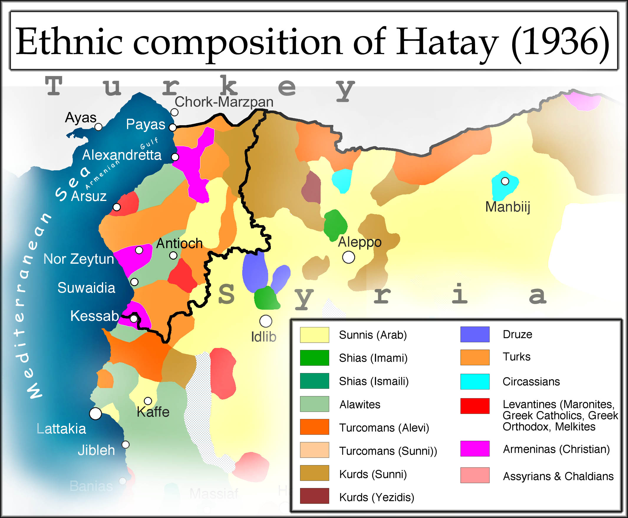 1936년 프랑스 고등 위원회의 자료에 따르면, 당시 알렉산드레타 산자크(하타이 지역)의 총 인구는 22만 명이었다.[12] 주요 민족 및 종교 집단별 인구 구성은 다음과 같다.