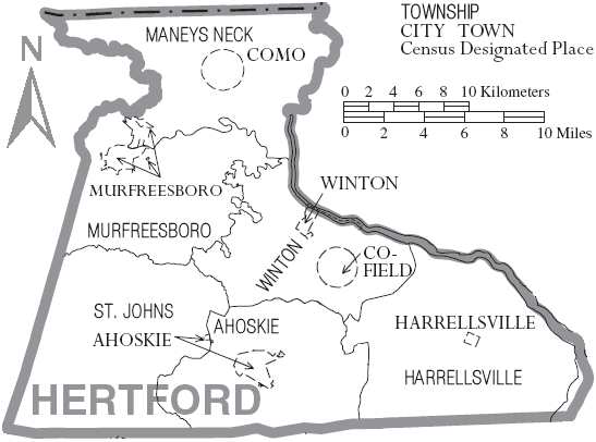 1759년, 버티군, 초완군, 노샘프턴군의 일부를 합쳐 하트퍼드군이 설립되었다. 군의 이름은 프랜시스 시모어-콘웨이 하트퍼드 후작의 이름을 따서 지어졌다. 1766년 윈턴 마을이 자치시로 지정되고 정부 소재지로 지정될 때까지 군 법원은 코튼의 페리에서 열렸다.[3]