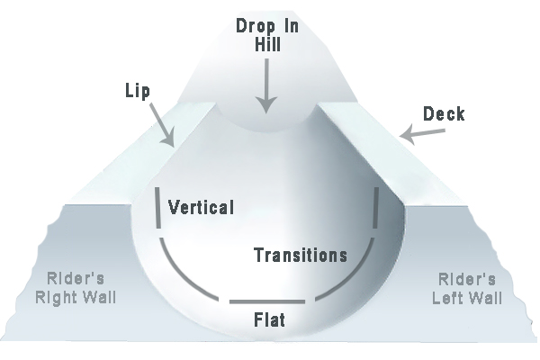 하프파이프의 구조는 수영장의 단면과 비슷하며, 본질적으로 두 개의 오목한 경사로(또는 쿼터파이프)가 평평한 전환 구간(트랜지션, 또는 트래니라고도 함)[1]을 사이에 두고 마주보고 있으며, 상단에는 코핑과 데크가 있다. 1980년대 이후로는 하프파이프에 쿼터파이프 사이에 넓은 평평한 바닥이 추가되었다. 평평한 지면은 착지 후 균형을 회복하고 다음 동작을 준비할 시간을 더 준다.하프파이프의 특징은 네 가지 속성, 즉 가장 중요한 전이 반지름과 높이, 그리고 그다음으로 중요한 바닥의 평평한 정도와 폭 사이의 관계에 따라 결정된다. 폭이 넓으면 더 긴 슬라이드와 그라인드가 가능하며, 바닥이 평평한 것은 회복 시간에 도움이 되지만, 필요 이상으로 길다면 아무런 목적이 없다.[3]