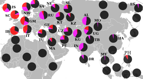 하플로그룹 R1a와 R1b의 분포 빈도. 분홍색이 R1a, 빨간색이 R1b
