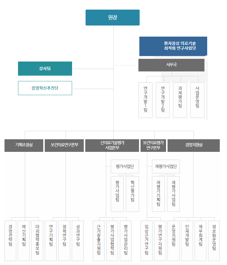 한국보건의료연구원은 이사회, 감사, 원장 등으로 구성되어 있다.
