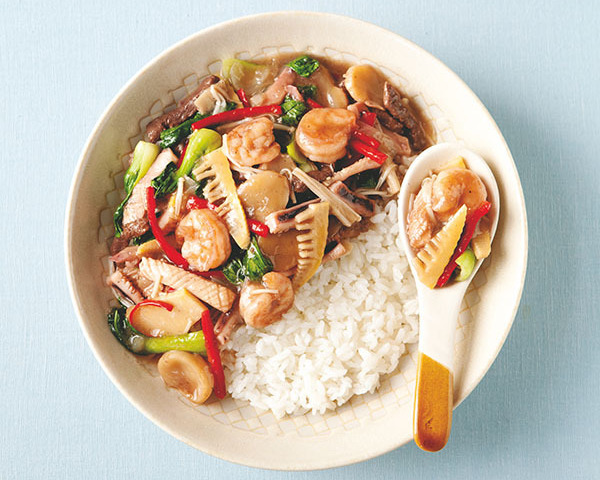 송이덮밥 | 洋菇蓋飯|양구가이판중국어 | 양송이버섯을 여러 가지 채소나 양념과 함께 볶아 밥 위에 얹어 먹는 음식이다. |