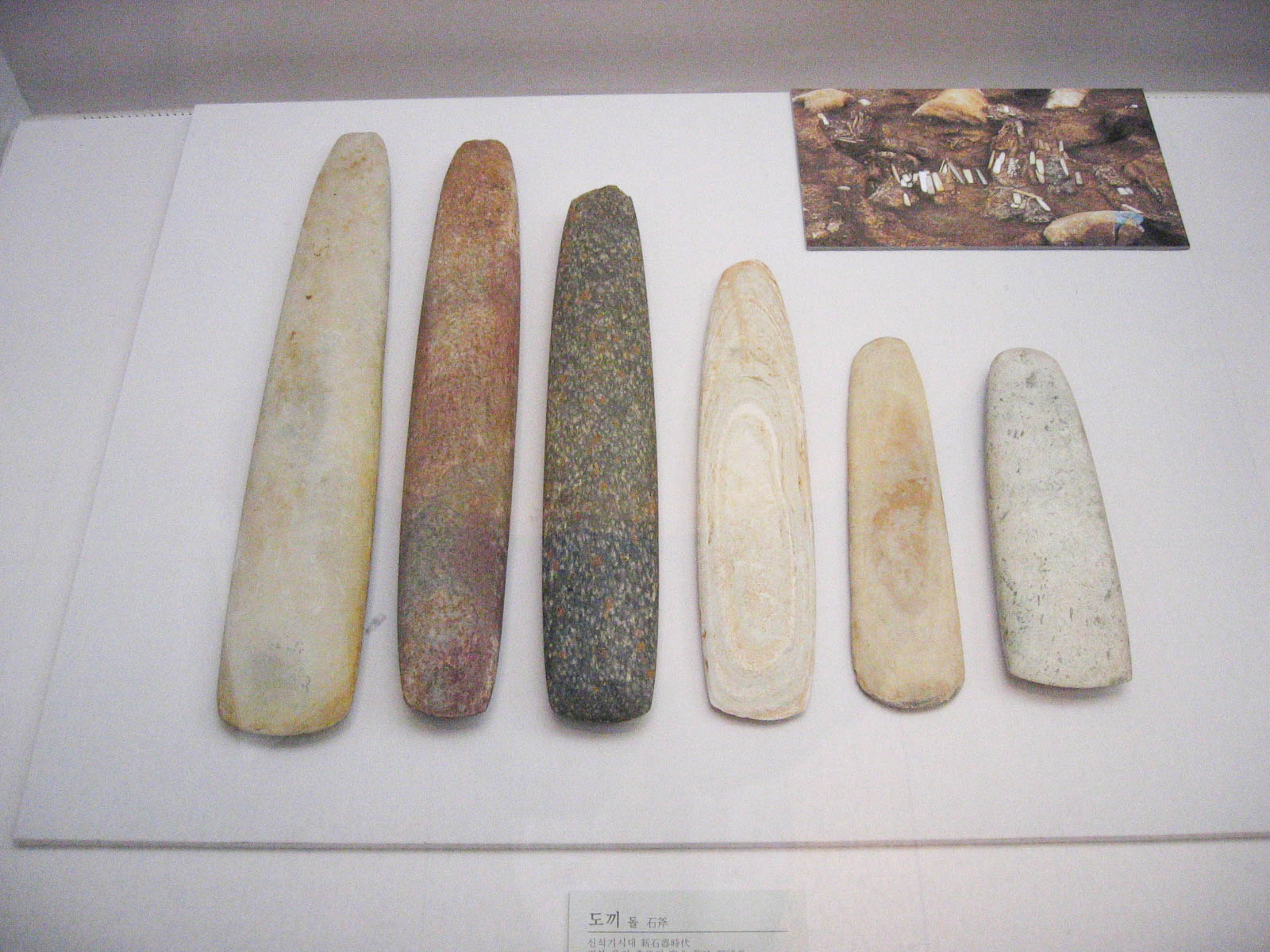 충청남도 공주 부근의 석장리 유적에서 구석기 전통을 가진 석기 시대 유물이 발견되었고, 인근에 규암, 반암, 흑요석 등이 있는데, 구석기 전기의 아슐리안(Acheulean)과 르발루아(Levallois)의 특성을 갖는다. 이러한 석기는 무늬가 단순하며, 석영이나 화강암(페그마타이트)에서 채취한 것이다. 석장리 유적의 중기 층에서는 투척용 볼라 (무기)와 투척용 돌이 발굴되었다.