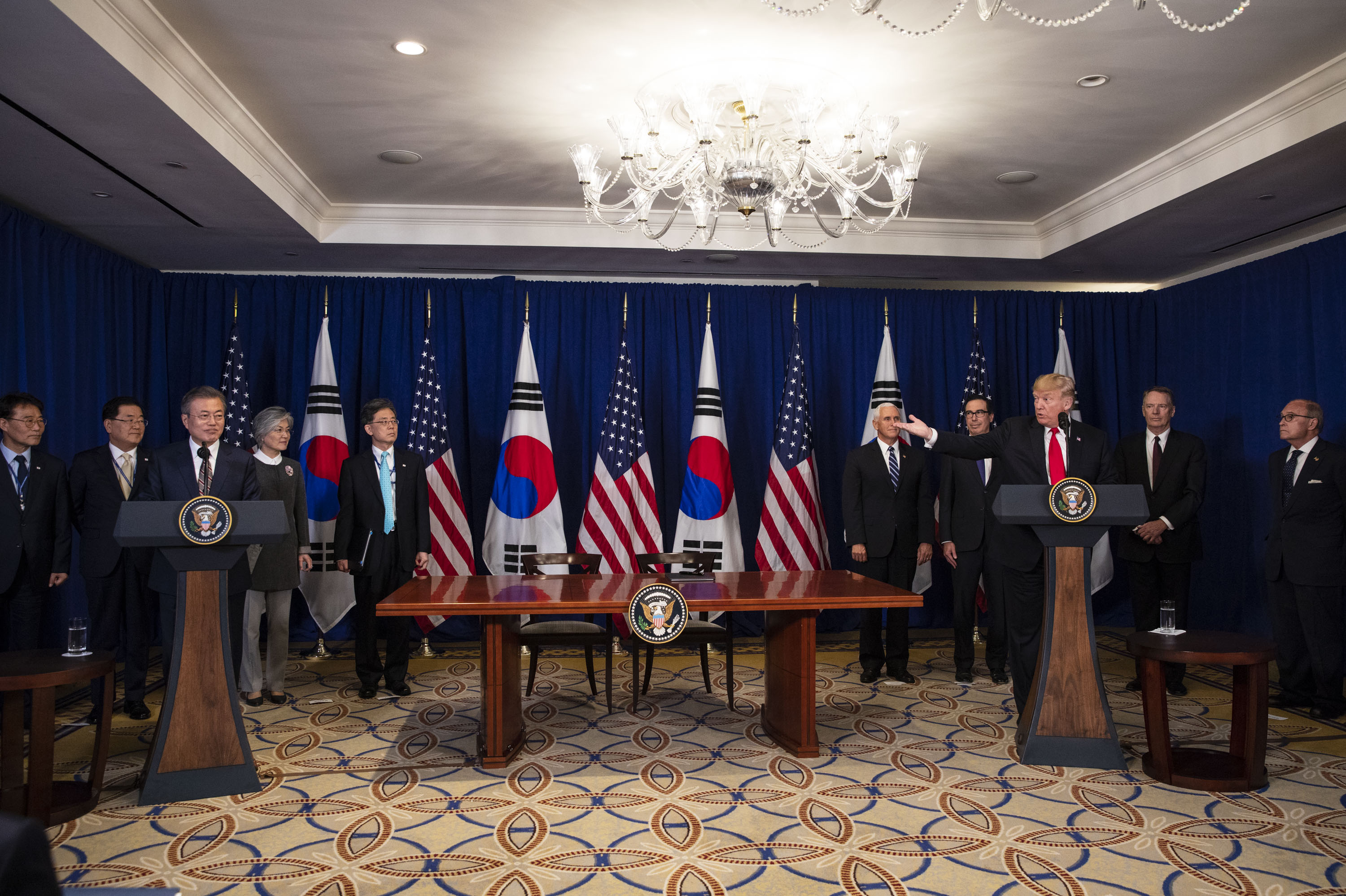 미국 대통령 도널드 트럼프 대통령과 대한민국 대통령 문재인 대통령이 2018년 9월 24일 한미 자유 무역 협정 서명 후 발언하고 있다.