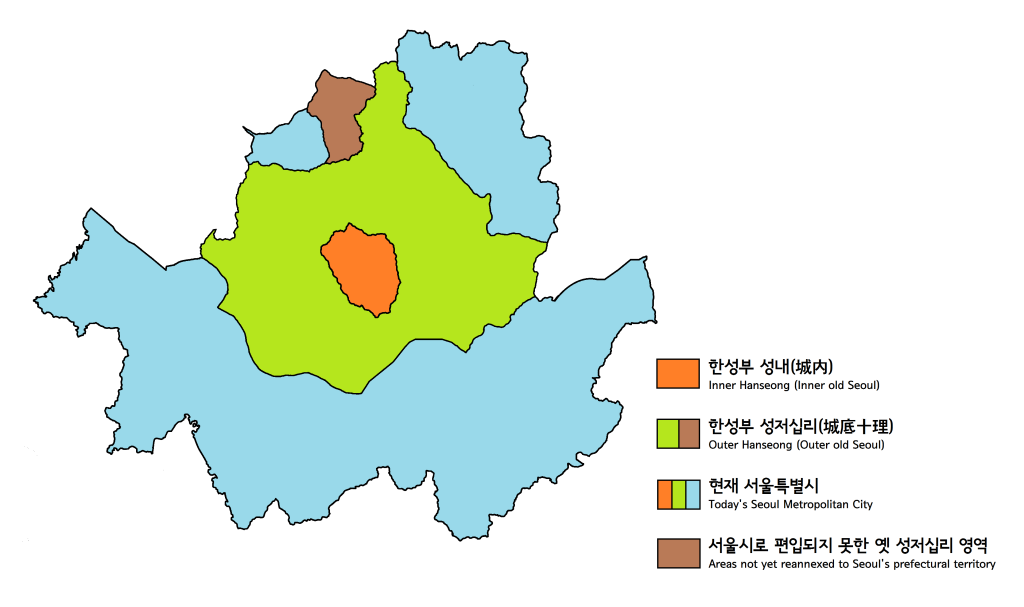 그러나 도성 안에 거주하는 인구가 점차 늘어나면서 성 안에 모든 인구를 수용할 수 없게 되었다. 이때부터 성곽으로부터 십 리 바깥까지의 지역을 '성저십리'라 칭하고, 성저십리로 인구 이동이 일어났다. 1461년 2월 27일, 성저십리는 공식적으로 한성부에 속하게 되어[18] 한성부의 영역이 확장되었다.