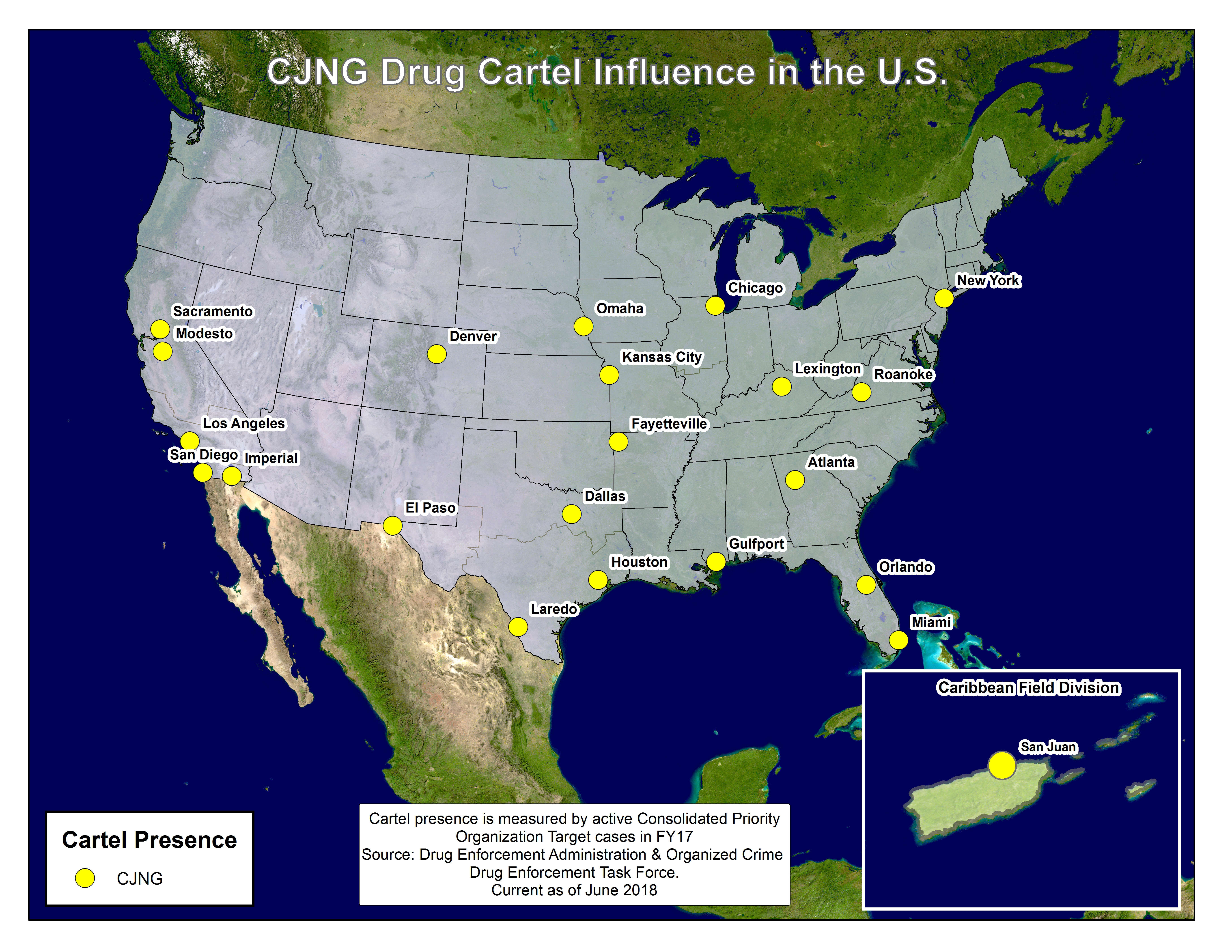 멕시코 재무부에 따르면, 이 카르텔은 할리스코, 나야리트, 아구아스칼리엔테스, 콜리마, 구아나후아토, 베라크루스, 바하칼리포르니아, 바하칼리포르니아수르, 소노라, 치와와, 코아우일라, 사카테카스, 마리아스 제도, 미초아칸, 게레로, 오아하카, 킨타나로오, 치아파스, 타바스코, 케레타로, 타마울리파스, 이달고, 산루이스포토시, 멕시코주, 모렐로스, 푸에블라 지역에 영토를 가지고 있다.[214][215]