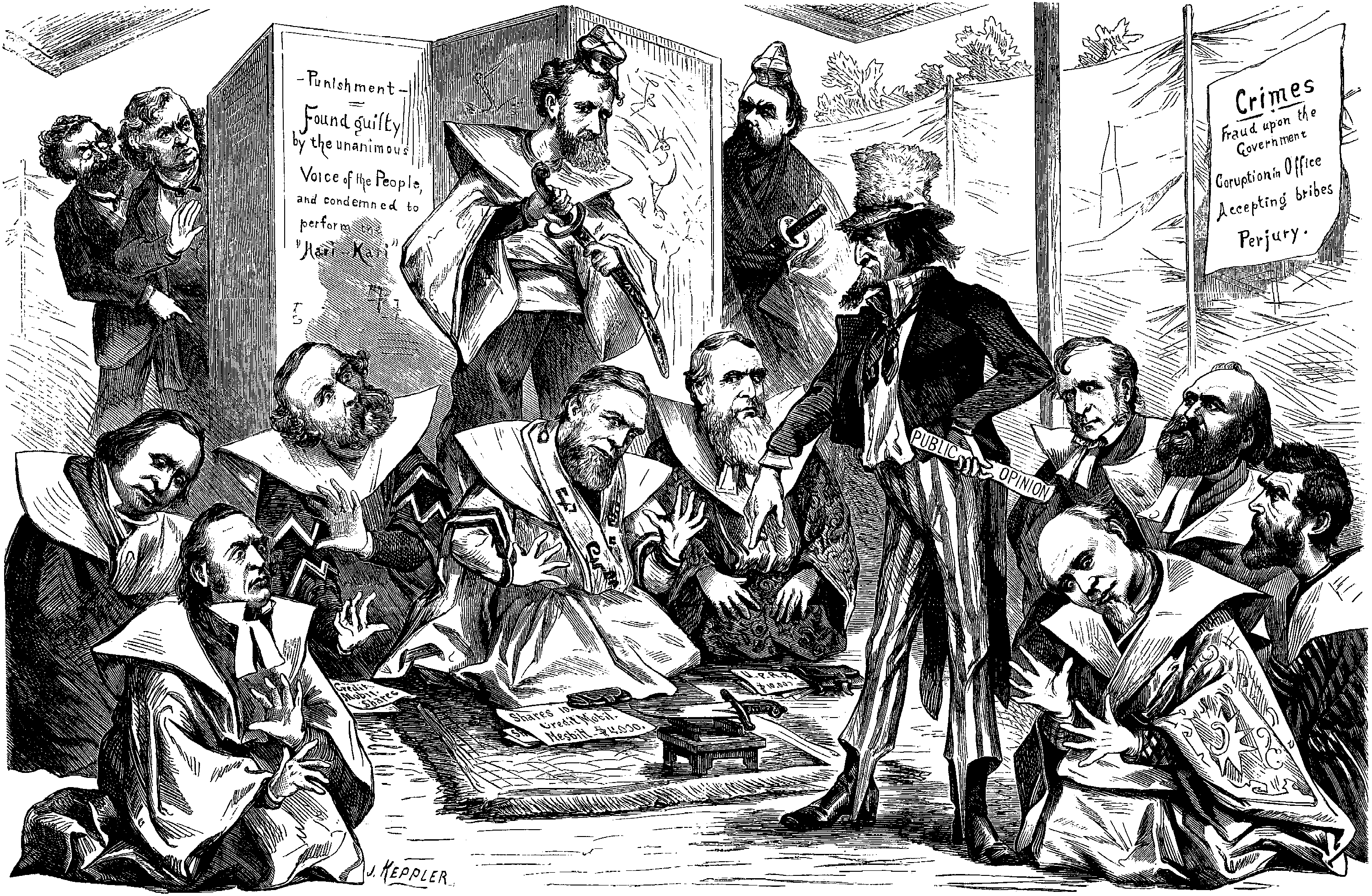 메이지 유신(Meiji Restoration) 기간 동안, 도쿠가와 쇼군의 보좌관이 할복했다. 미트포드는 비젠 번의 장교 타키 젠자부로의 할복을 목격한 것을 묘사했다.[33]