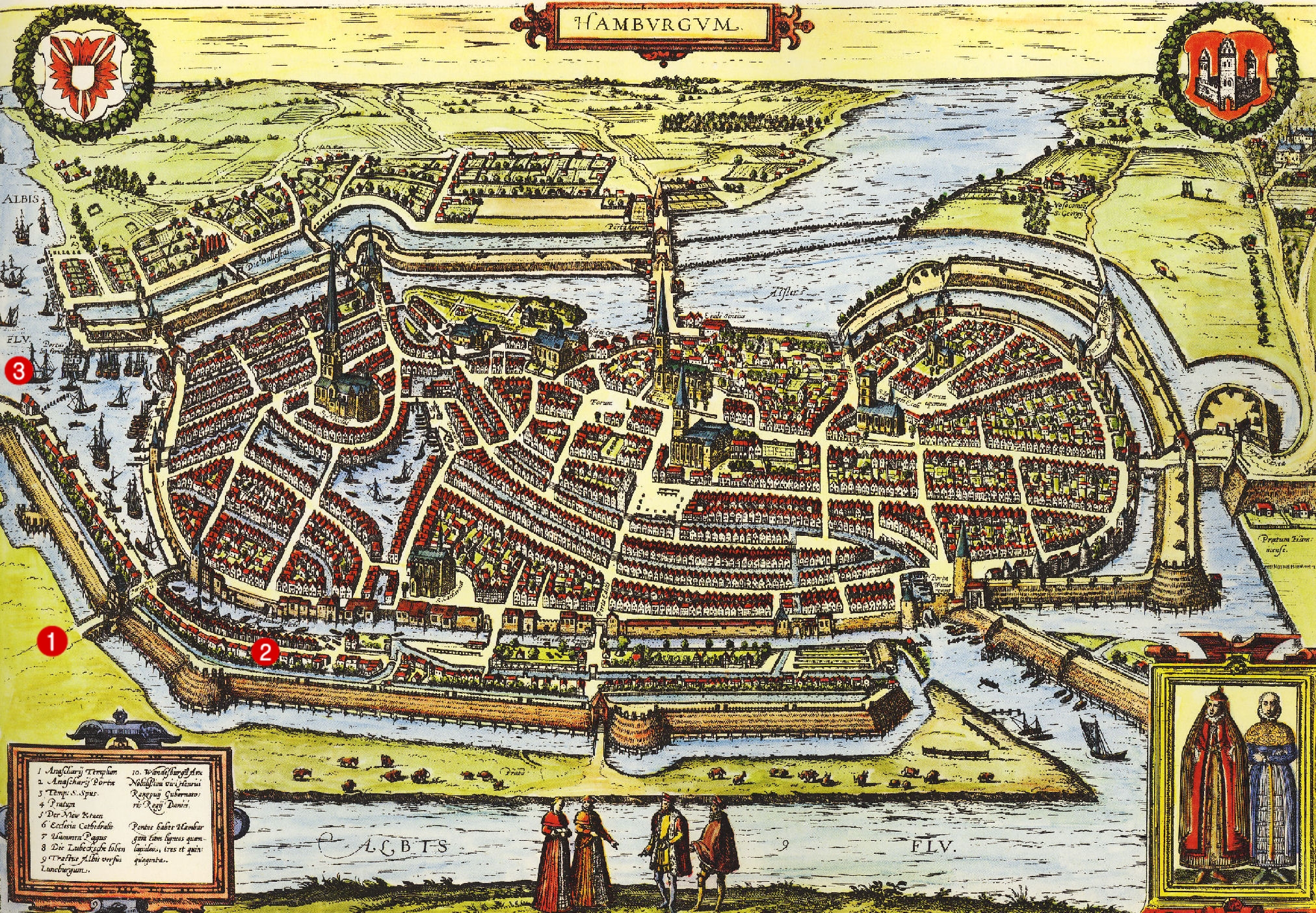 1529년, 함부르크는 루터교를 받아들였고, 네덜란드와 프랑스에서 온 개혁파 난민들을 수용했다.[26] 17세기 삼십년 전쟁에 대비하여 얀 판 발켄보르흐가 요새에 두 번째 방어층을 추가하면서 함부르크는 확장되었고, 그가 도입한 도로망 체계를 따르는 거리 이름들이 남아 있는 "신시가지"(Neustadt)가 생겨났다.[26]