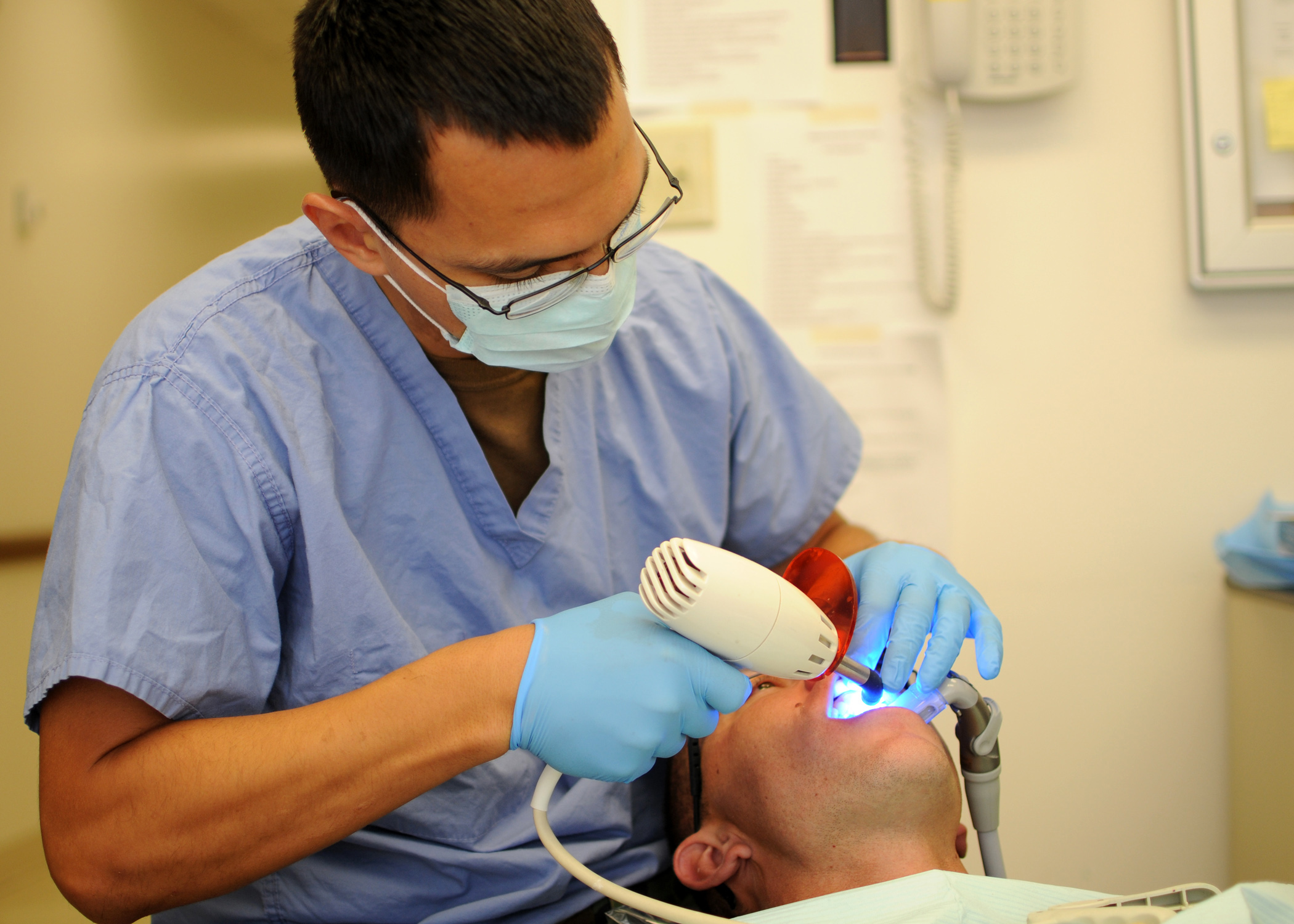 치과용 경화기를 사용하여 치과용 시멘트의 경화 반응을 시작하는 모습