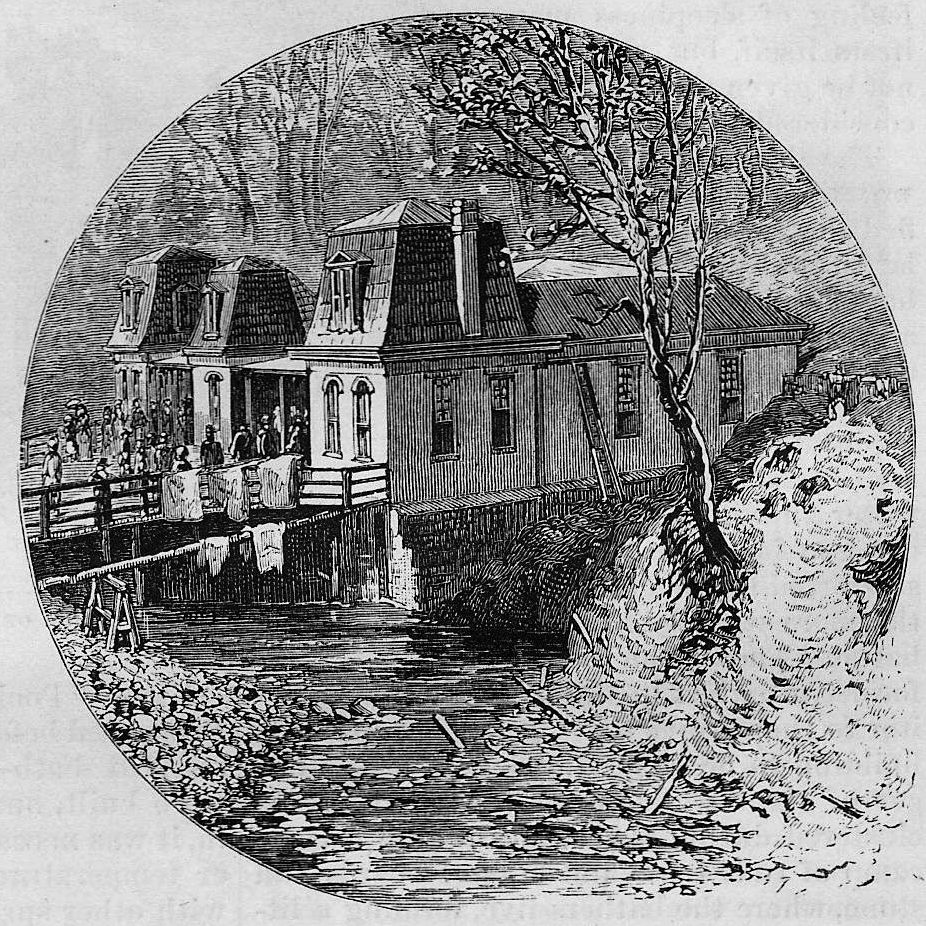 최초의 목욕탕은 온천에서 흘러나오는 뜨거운 물을 받기 위해 바위 틈에 설치된 간단한 수풀 오두막과 통나무집이었다. 이후 사업가들은 언덕에서 흘러내리는 물을 핫스프링스 크릭 동쪽 강변을 따라 있는 목욕탕으로 공급하는 나무 물통을 갖춘 더 정교한 목욕 시설을 개발했다. 언덕을 덮고 있는 일부 응회암은 목욕탕을 수용하기 위해 파냈다. 시냇물의 서쪽에 있는 좁은 길은 좁은 다리로 목욕탕과 연결되었다.