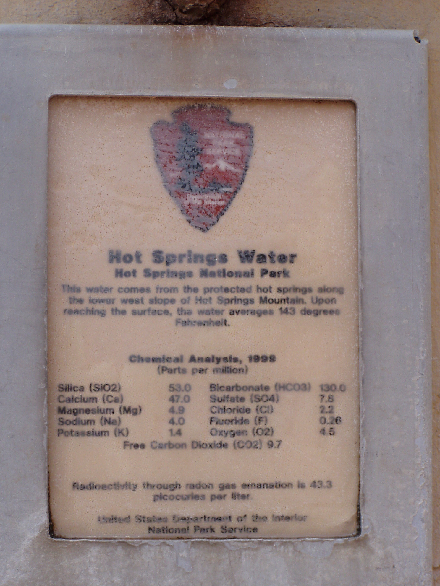 핫스프링스 온천수는 모두 동일한 깊은 수원에서 나오지만, 샘마다 표면 모습은 다르다. 머드 스프링(Mud Spring)은 화상 위험이 없는 미지근한 물이 나오는 곳이다. 샘에는 마그네시아(Magnesia), 빅 아이언(Big Iron), 아르세닉(Arsenic)과 같은 이름이 붙여졌다. 빅 아이언의 물은 상당량의 용해된 철을 함유하여 황토색 껍질과 얼룩을 생성했다. 반면, 아르세닉 스프링에서는 비소 성분이 전혀 검출되지 않았다. 현재 많은 샘의 물은 하나의 공급원으로 합쳐져 하루에 750000USgal에서 950000USgal의 물을 생산한다. 온도는 평균 약 약 61.7°C이며, 기록이 보관된 이후 최고 온도에서 약 약 2.8°C 감소했다.[26]1905년, 예일 대학교의 버트럼 볼트우드는 온천수의 치료 특성이 라듐 때문이라고 여겨 물을 조사했다. 조사 결과, 용해된 라돈 가스와 일부 라듐으로 인해 측정 가능한 수준의 방사능이 존재했다. 당시 수집 및 분배 장비는 라돈 가스를 유지하도록 설계되었지만, 현재는 라돈 가스가 빠져나가도록 설계되었다. 목욕으로 인한 방사선 노출 수준은 같은 시간 동안 햇볕에 앉아 있을 때와 유사한 수준으로, 국립공원 물은 안전 한계 내에 있으며 전 세계 다른 자연수와 유사하다고 여겨진다.[26]