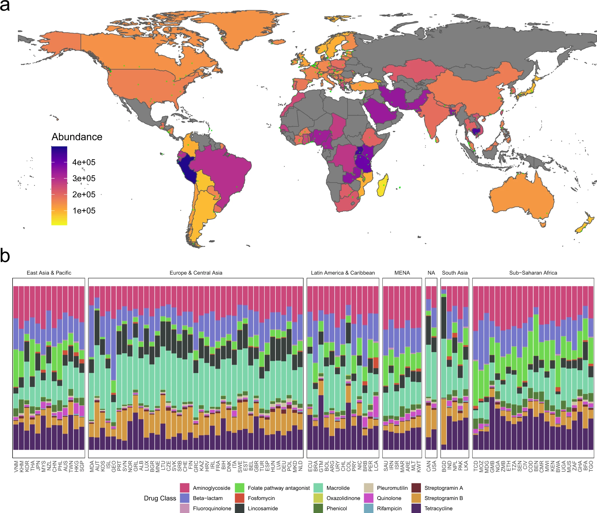 내성과 관련된 사망의 가장 큰 원인이 되는 6가지 병원체는 ''대장균'', ''황색 포도상구균, 폐렴구균, 폐렴 연쇄상구균, 아시네토박터 바우마니, 녹농균''이다. 이들은 2019년에 내성으로 인한 929,000명의 사망과 내성과 관련된 357만 명의 사망에 책임이 있었다.[152]