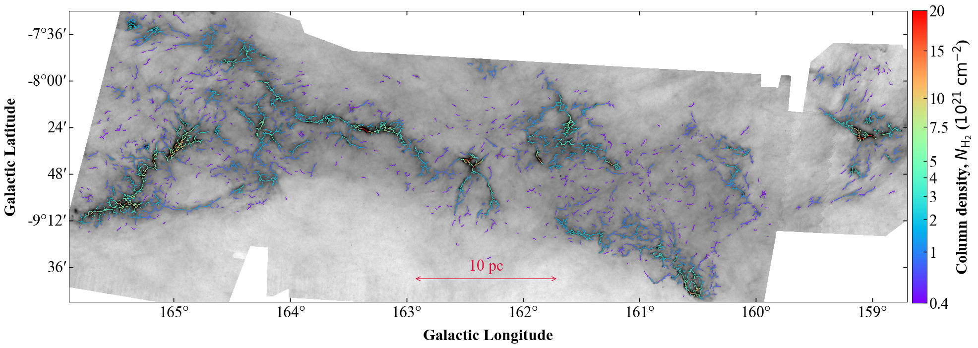 허셜 우주 관측소는 필라멘트, 즉 길쭉한 밀집 가스 구조가 분자 구름에 어디에나 존재하며 별 형성 과정의 중심이라는 것을 밝혀냈다. 이들은 중력적으로 묶인 코어로 분열되며, 이 중 대부분은 별로 진화한다. 가스의 지속적인 강착, 기하학적 굽힘, 자기장은 필라멘트가 분열되는 세부적인 방식을 제어할 수 있다.