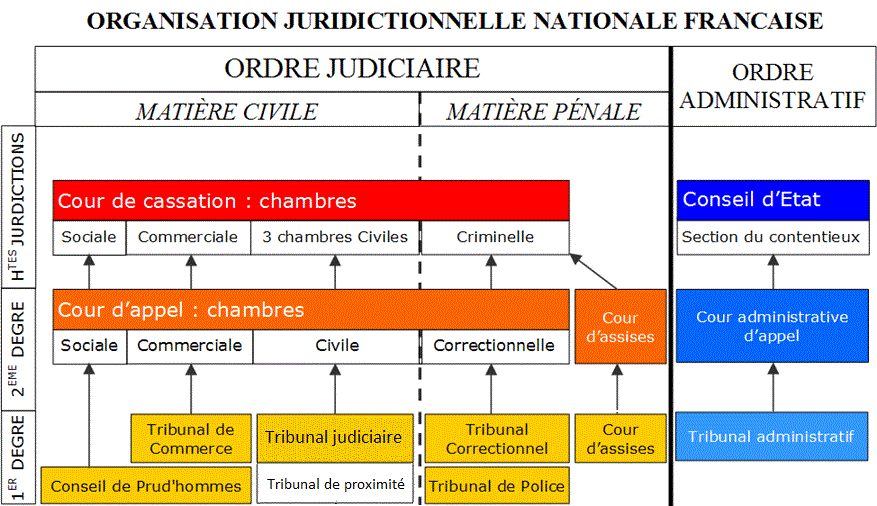 1958년까지, 치안 판사(평화 재판관)의 판결에 대한 항소 및 노동 법원 (''de prud'hommes'') 판결은 ''tribunal civil'' (민사 법원)으로 제기되었으며, ''tribunaux paritaires des baux ruraux''의 항소를 위한 ''d'arrondissement'' 법원과 제1심의 결정을 항소하기 위한 ''sécurité sociale''의 지역 위원회가 존재했다. 항소 법원은 민사 사건에서 민사 법원 또는 상업 법원의 판결에 대한 구제를 인정한다.[2] 형사 사건에서 항소 법원은 교정 및 경찰 법원 항소를 수용한다.