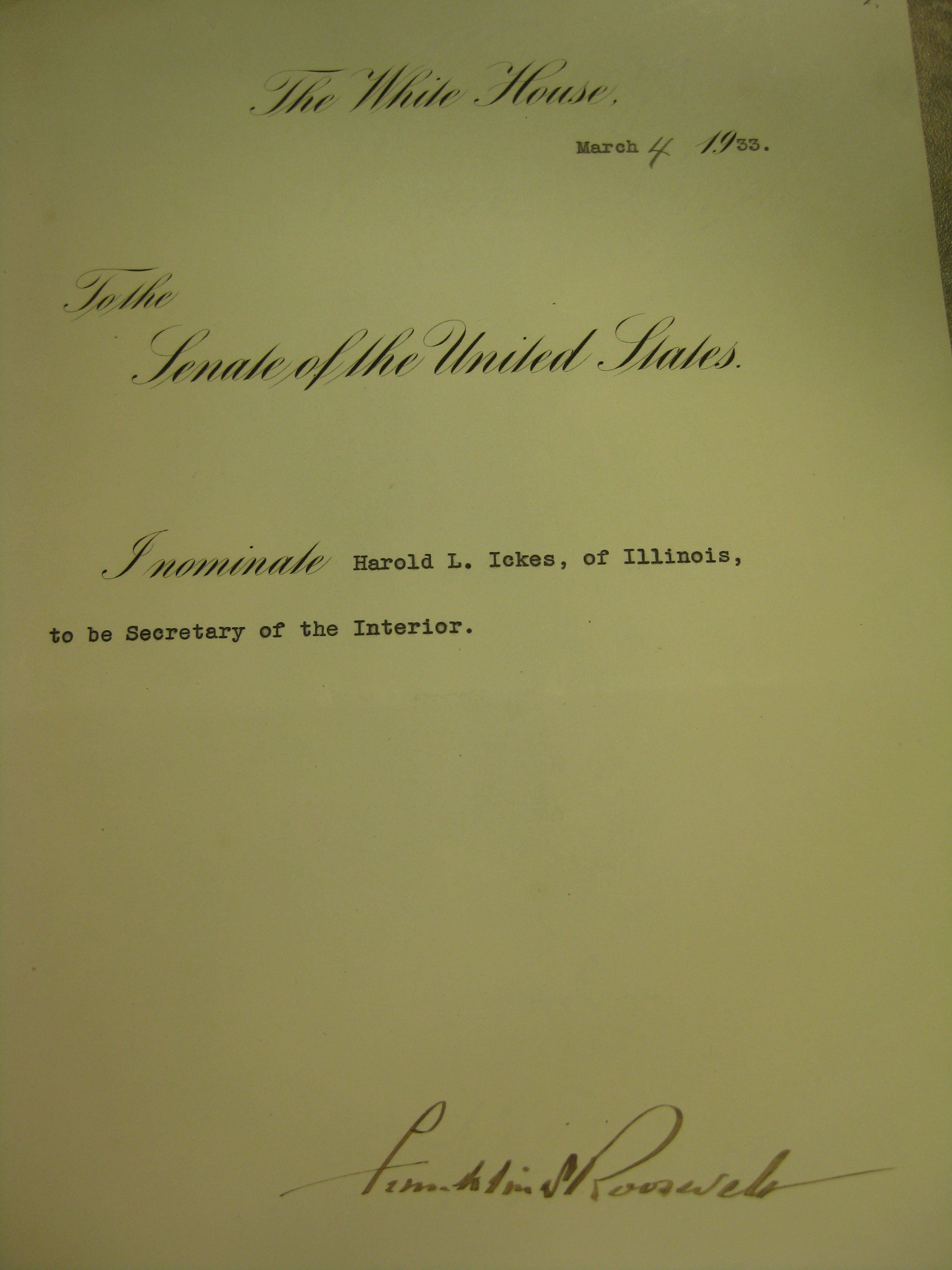 이커스의 내무 장관 지명 문서.