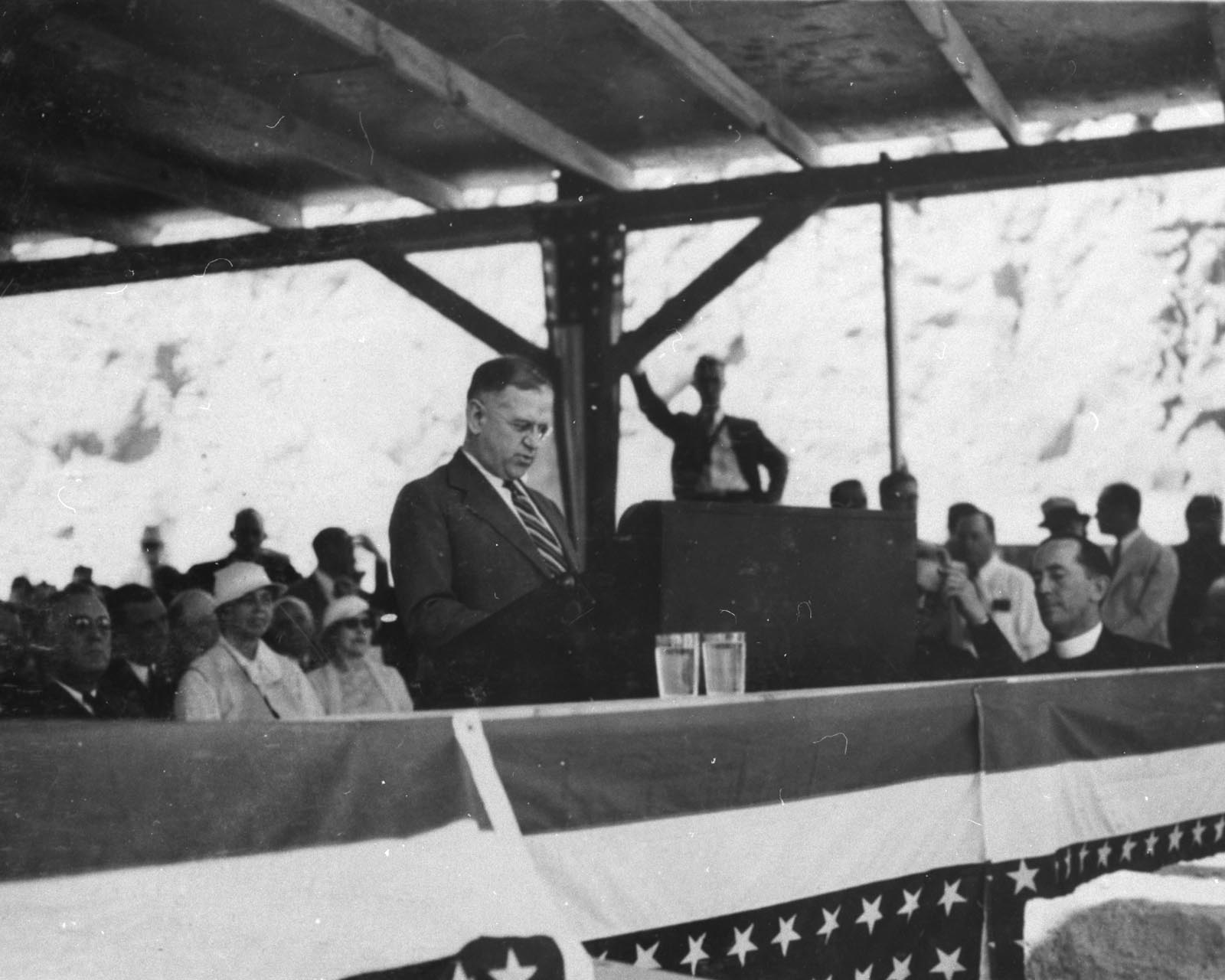 해럴드 L. 이커스가 후버 댐(당시 볼더 댐) 준공식에서 연설하고 있다