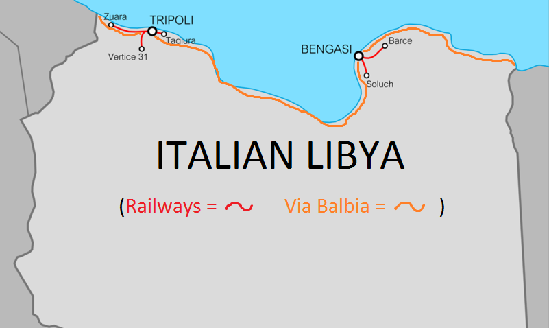 리비아로 가는 이탈리아 보급품의 일반적인 해상 경로는 시칠리아 서쪽을 지나 몰타에 주둔한 영국 항공기, 선박, 잠수함의 방해를 피하기 위해 해안에 가깝게 트리폴리 항구로 향했다. 이탈리아 상선의 3분의 1이 이탈리아의 참전 이후 억류되었고, 이 우회로로 인해 항해 거리가 약 약 965.60km로 늘어났다. 육상에서는 보급품을 도로로 엄청난 거리를 운송하거나 작은 화물선으로 소량씩 운송해야 했다. 컴파스 작전에서 이탈리아가 패배한 후, 트리폴리는 마지막 남은 추축국 항구였으며, 최대 하역 능력은 병력 수송선 4척 또는 화물선 5척으로, 한 달에 약 약 45722115.00kg의 화물을 운송할 수 있었다. 트리폴리에서 벵가지까지의 거리는 Via Balbiait를 따라 652km였는데, 이는 알렉산드리아까지 가는 길의 절반 정도였다.