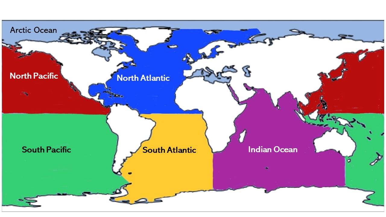 "대양과 바다의 경계"에서 정의된 주요 해양 분지를 보여주는 그림입니다. 경계는 대륙의 지리적 특징과 적도를 기준으로 합니다.